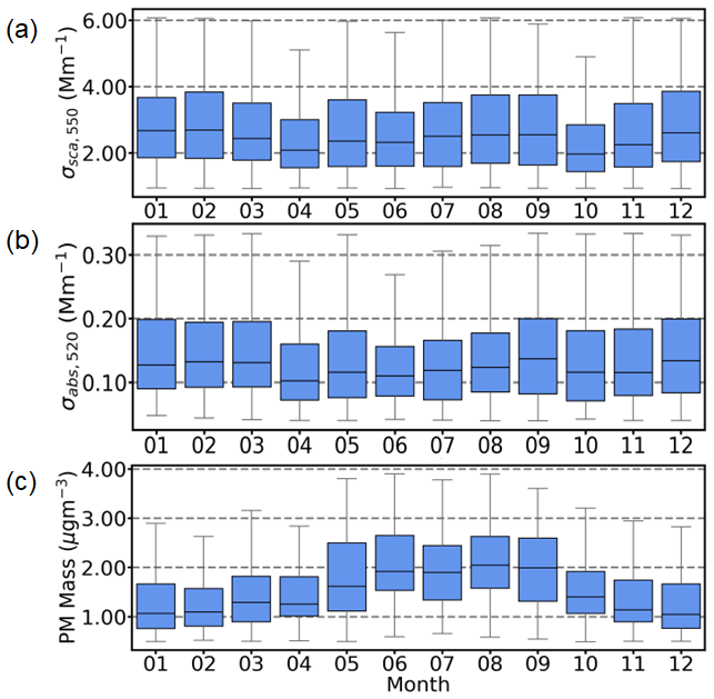 Particulate samples are weighed to produce aerosol mass distribution in two-to-three-day averages. The mass distributions are calculated based on the differences in filter weights before and after sampling. Once weighed, the filters are stored in a freezer to preserve the samples for future chemical and physical analyses. This procedure ensures the reliable collection, quantification, and archiving of aerosol particle data for long-term studies. The PM mass data across different aerosol particle size ranges, i.e. PM1, PM10 and super-PM10 was merged with the hourly resampled aerosol optical properties (AOPs).