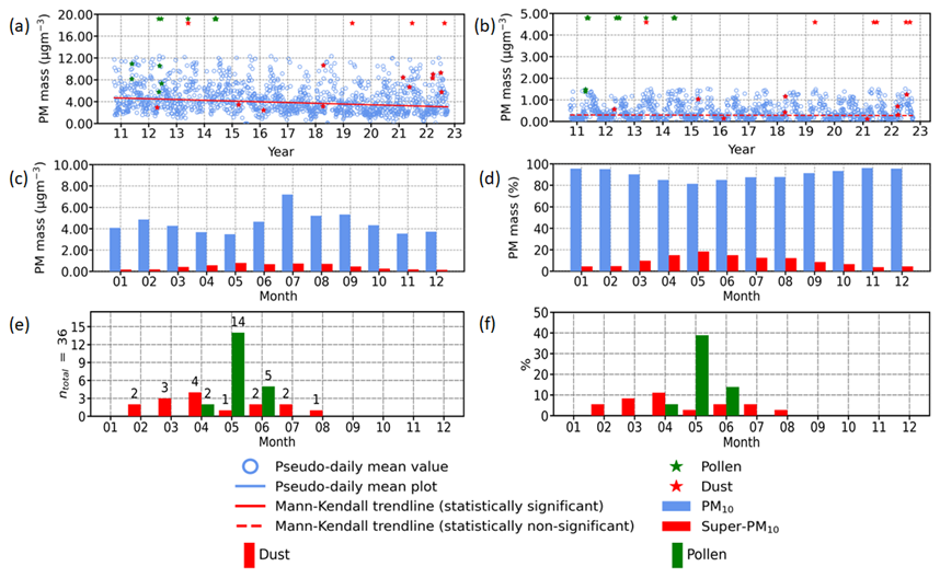 Although this study focuses on PM1 and PM1–10 fractions, investigating trends in super-PM10 aerosol particles may provide additional insights into long-term shifts in coarse-mode aerosol composition that are not detected by the optical instruments and the used 10 µm cut-off. Super-PM10 particles, which include biological aerosols (e.g., pollen, fungal spores) and mineral dust, are strongly influenced by episodic events such as seasonally driven biological emissions and long-range dust transport. However, their long-term trends remain poorly constrained.