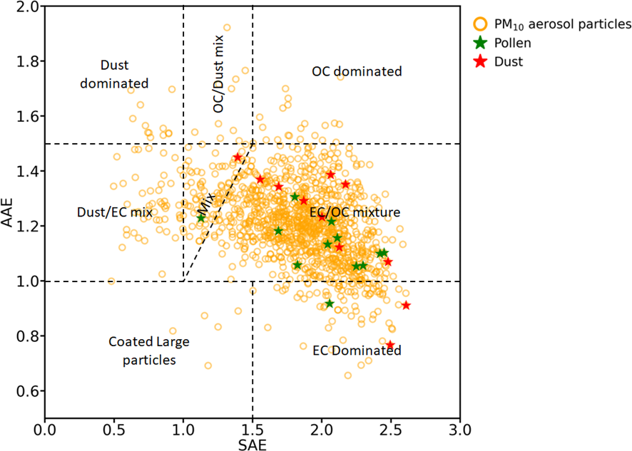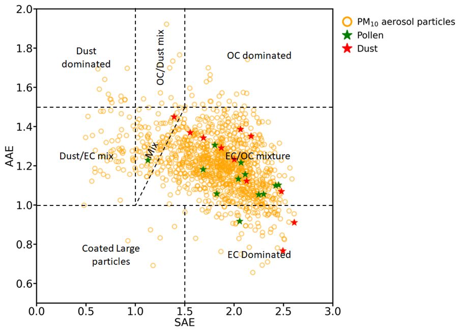 Assess the statistical significance of episodic events, such as pollen outbreaks and dust transport, on the optical properties of PM1–10 aerosol particles.