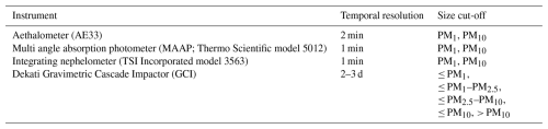 The Station for Measuring Ecosystem–Atmosphere Relations (SMEAR II) is located in Hyytiälä, southern Finland (61°51′ N, 24°17′ E; 181 m a.s.l.). It is located in a boreal forest and is classified as a background site where no major local sources of aerosol particles from anthropogenic activities are observed (Hari and Kulmala, 2005). However, there are some sources of pollution in the region, such as the city of Tampere (60 km in the southwest direction with a population of 241 000 in 2021) and the activity of the buildings in the station (Kulmala et al., 2001; Boy et al., 2004). Therefore, SMEAR II reflects typical boreal forest conditions (Hari et al., 2013). It has instruments to measure interactions between the forest ecosystem and the atmosphere and the station is part of ACTRIS (Laj et al., 2024). The station has various aerosol instruments, including the four instruments used in this study: two Magee Scientific aethalometers (models AE31 and AE33) to obtain the light absorption coefficient at seven wavelengths, a TSI integrating nephelometer (model 3563) to calculate the light scattering coefficient at three wavelengths and a Dekati cascade gravimetric impactor to measure the PM mass of different size fractions (i.e. ≤ PM1, between PM1 and PM2.5, between PM2.5 and PM10, ≤ PM10, > PM10). The instruments are described in more detail in the following sections. All these instruments are in a “Hitumökki”, i.e., the “Aerosol Cottage”.