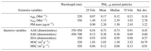 Table 3Long-term trends and statistical significance of PM1–10 aerosol optical and PM1–10 mass properties.
