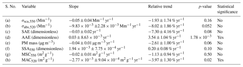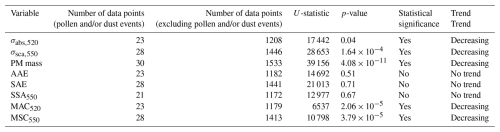 For calculating the trends in the different aerosol optical data, the Mann-Kendall regression was used to effectively handle outliers without assuming a normal distribution (Mann, 1945; Collaud Coen et al., 2020). This method also minimizes the risk of Type I errors, which can occur when a trend is incorrectly identified as “statistically significant” due to an anomaly in the data (i.e., autocorrelation). Additionally, Theil-Sen's slope estimator has been used to quantify the slope of the trends, providing a reliable measure of the long-term changes in the aerosol optical properties, even if there are non-linear trends and seasonal fluctuations in the data (Sen, 1968; Theil, 1950; Collaud Coen et al., 2020).