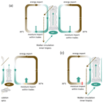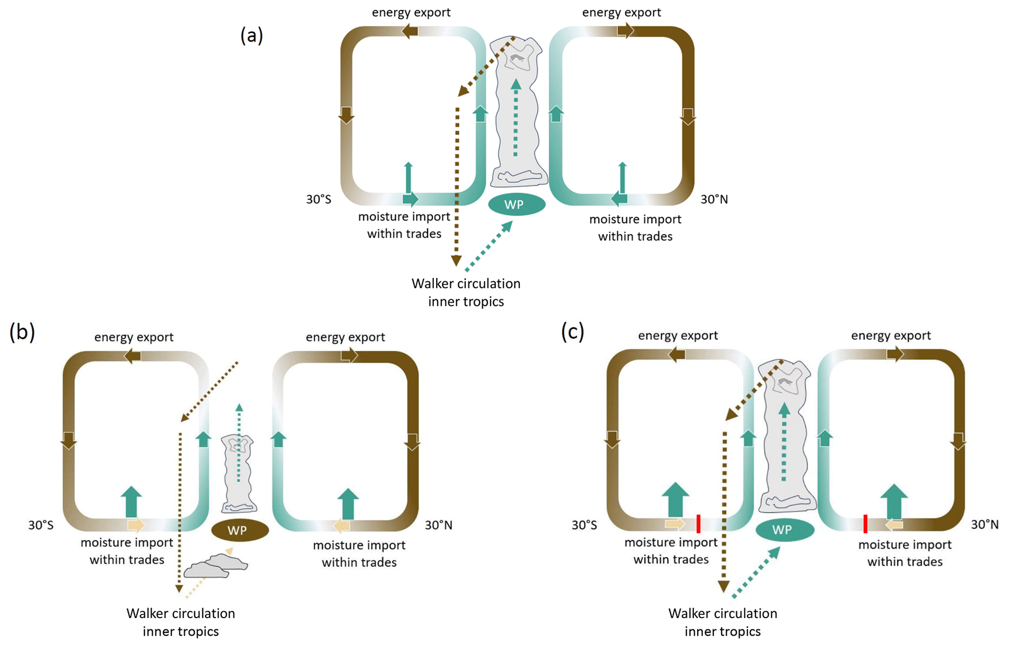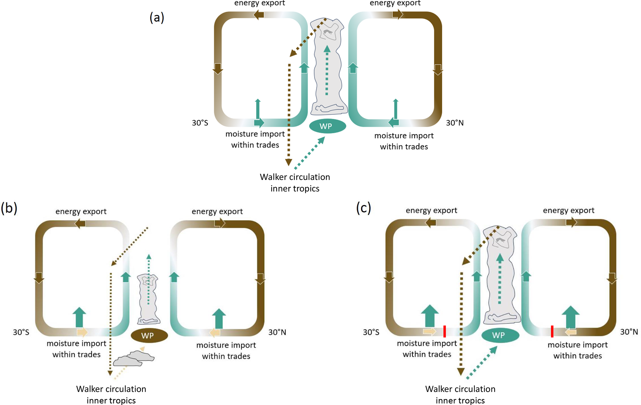 Figure 1Conceptual depiction of the main zonal and meridional circulations exchanging moisture and energy between the subtropics and the tropics as (a) observed, (b) in default ICON simulations, and (c) in Umin adjusted ICON simulations. Observations show that the moisture within the innermost tropics originates from evaporation in tropical and subtropical areas. The moisture is imported into the innermost tropics by the trade winds, with small losses to the free troposphere. In the innermost tropics it is then transported to the main convective regions, i.e., the Warm Pool (WP) within the zonally anomalous Walker circulation. Energy is exported to the subtropics within the outward branches of the Hadley circulation. In conventional ICON simulations (b), a large portion of the subtropical moisture is lost due to too much vertical transport of moisture from the boundary layer to the free troposphere. This leads to a moisture deficit in the tropics, specifically over the WP, reducing deep convection, slowing down the Walker circulation and leading to spurious additional convective centers over the Eastern Pacific as too little moisture is transported to the WP within the boundary layer. In the Umin adjusted ICON simulations (c) increased evaporation leads to an additional moisture source in the tropics, which resolves the dry bias over the WP. However, the adjustments increase the positive free-tropospheric moisture bias between 0 to 30°, reduce the trade wind strength and change the balance between innermost-tropical and subtropical sources of tropical moisture content. Green colors indicate high moisture content. Brown colors low moisture content.