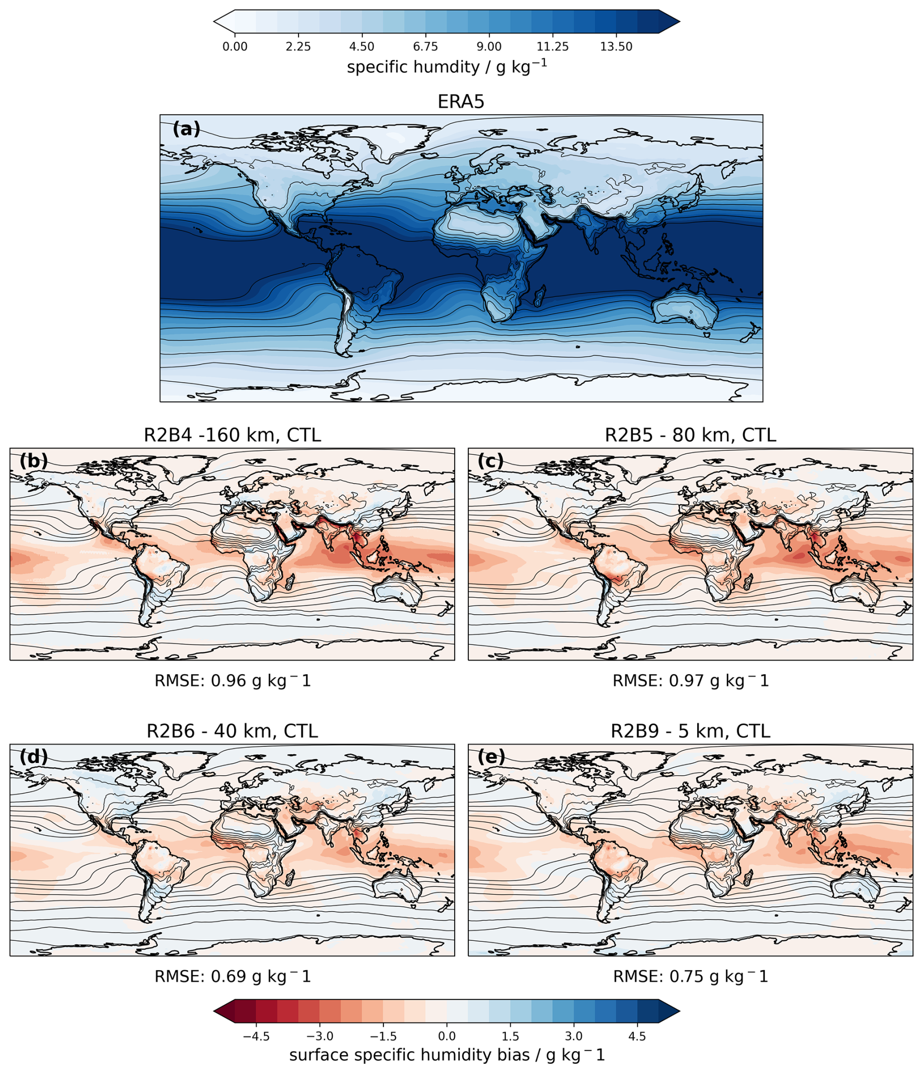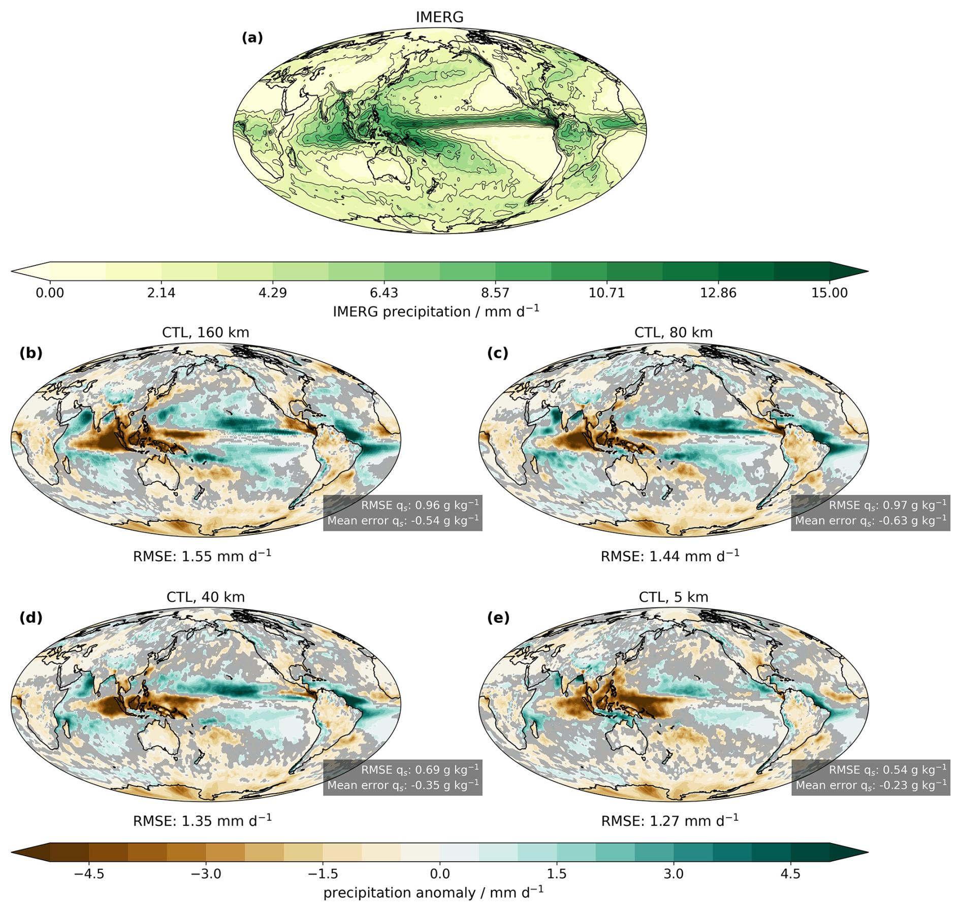 Figure 2(a) Climatological IMERG precipitation distribution from 2004 to 2010 and (b–e) two-year mean precipitation bias with respect to IMERG for 160 km (b), 80 km (c), 40 km (d) and 5 km (e) setups. Statistically insignificant differences between IMERG and the experiments based on a two sided z-test at α=0.1 are grayed out in (b)–(e). The corresponding global RMSE in precipitation is stated beneath the panel for each resolution experiment. The global RMSE and mean error in near-surface specific humidity, calculated with respect to values derived from ERA5 reanalysis, is depicted in the inlays.
