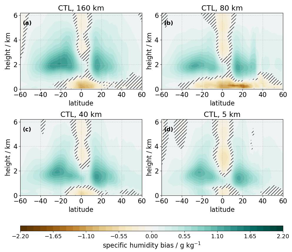 Figure 3(a–d) Two-year atmospheric specific humidity bias with respect to ERA5 (2004–2010) for 160 km (a), 80 km (b), 40 km (c) and 5 km setups (d). Statistically significant differences between ERA5 and the model data are shown, and insignificant regions are dashed out.