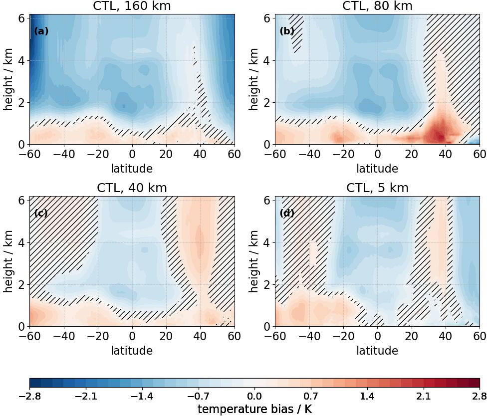 Figure 4(a–d) Two-year atmospheric temperature bias with respect to ERA5 (2004 to 2010) for 160 km (a), 80 km (b), 40 km (c) and 5 km (d) setups. Statistically significant differences between ERA5 and the model data are shown, insignificant regions are dashed out.