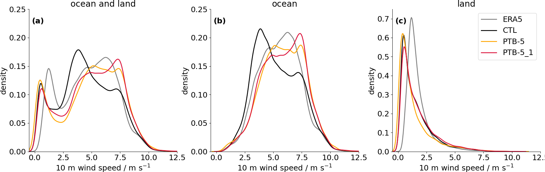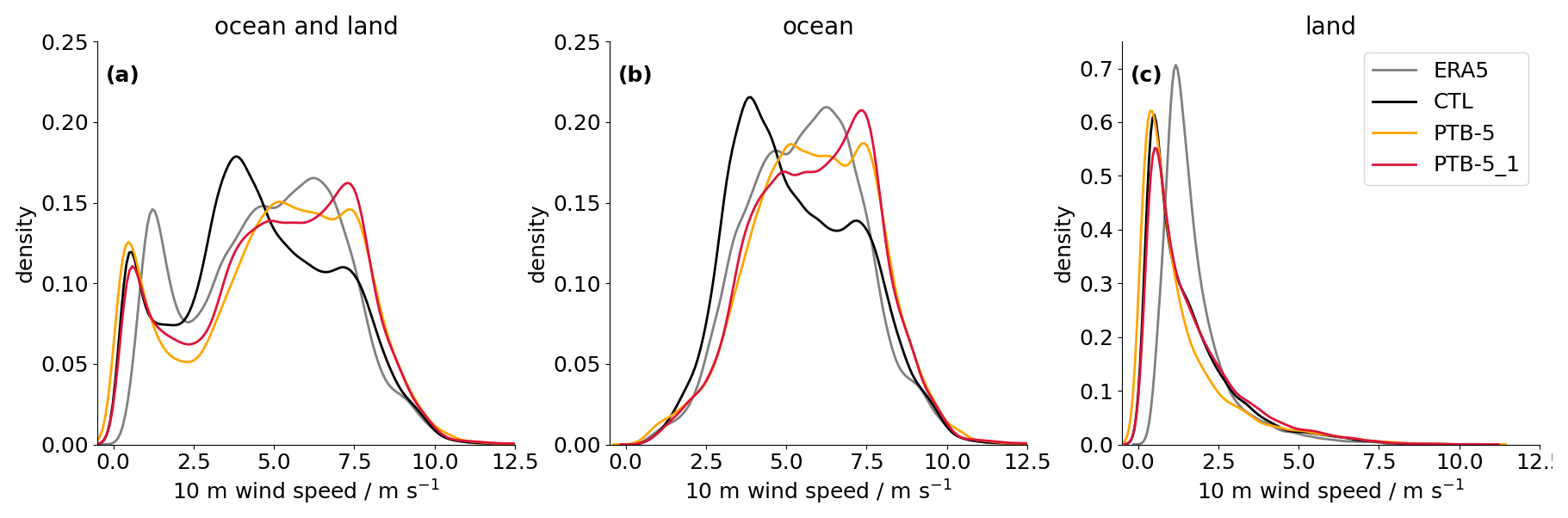 Figure 6Normalized probability density functions of the monthly mean near-surface wind speed distributions between 10° S to 10° N in the experiments CTL, PTB-5 and PTB-5_1. A comparison with ERA5 data is given for (a) the entire region, (b) over ocean only, and (c) over land only.