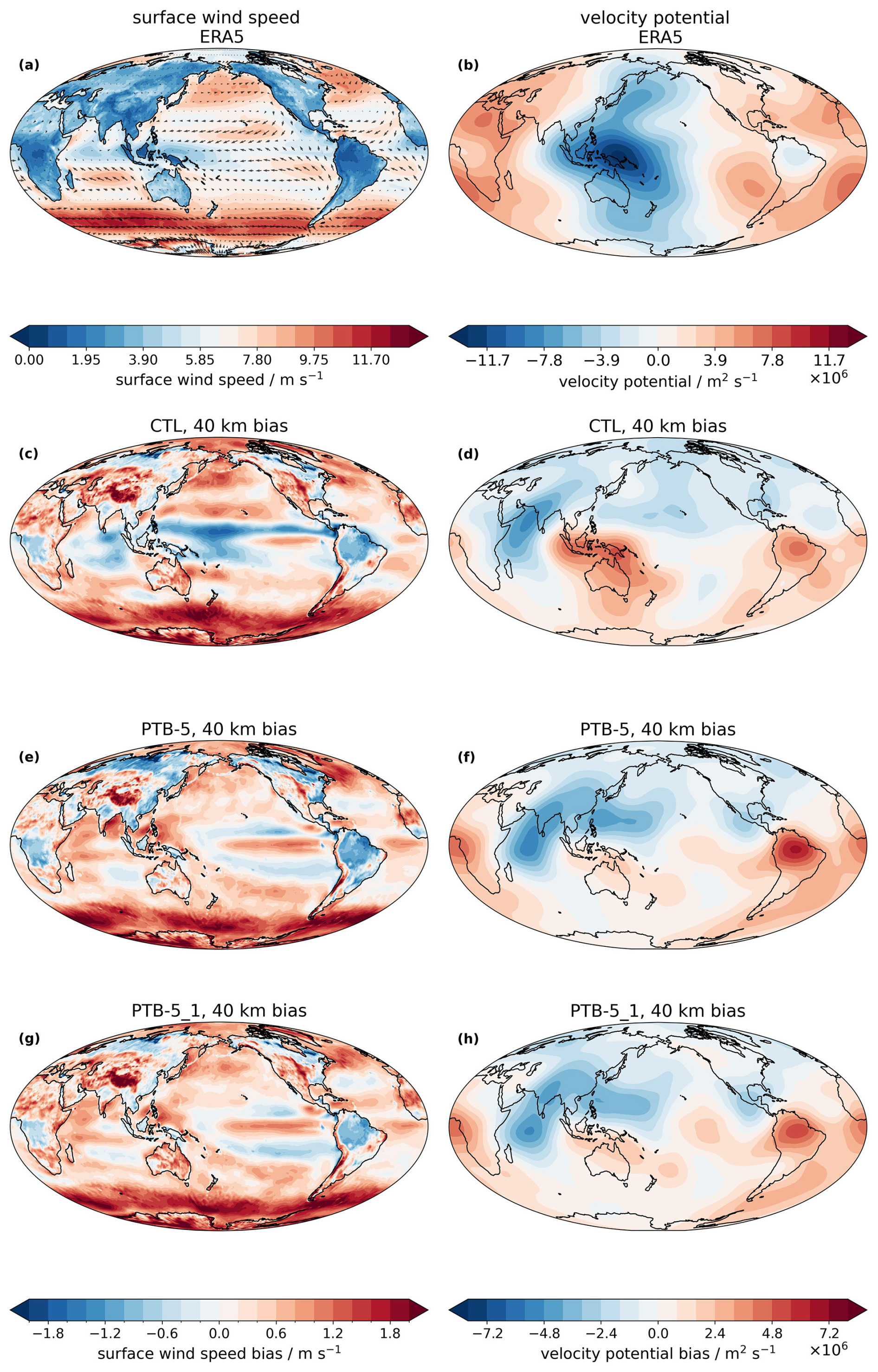 Figure 7(a) ERA5 multi-year average near surface wind speeds for the years 2004–2010. Arrows visualizing the near-surface wind speed for ERA5 are superimposed to visualize the general circulation. (c, e, g) Two-year mean large-scale near-surface wind speed bias with respect to ERA5 for CTL and different settings of the near-surface wind speed limiter, Umin, in 40 km resolution: PTB-5, PTB-5_1. (b) ERA5 multi-year average velocity potential χ at 200 hPa for the years 2004-2010. (d, f, h) Two-year mean bias of the CTL, PTB-5 and PTB-5_1 experiment with respect to the ERA5 velocity potential. Negative values of the velocity potential are found in regions of ascent and divergent motion; positive values in region of subsidence and convergence.