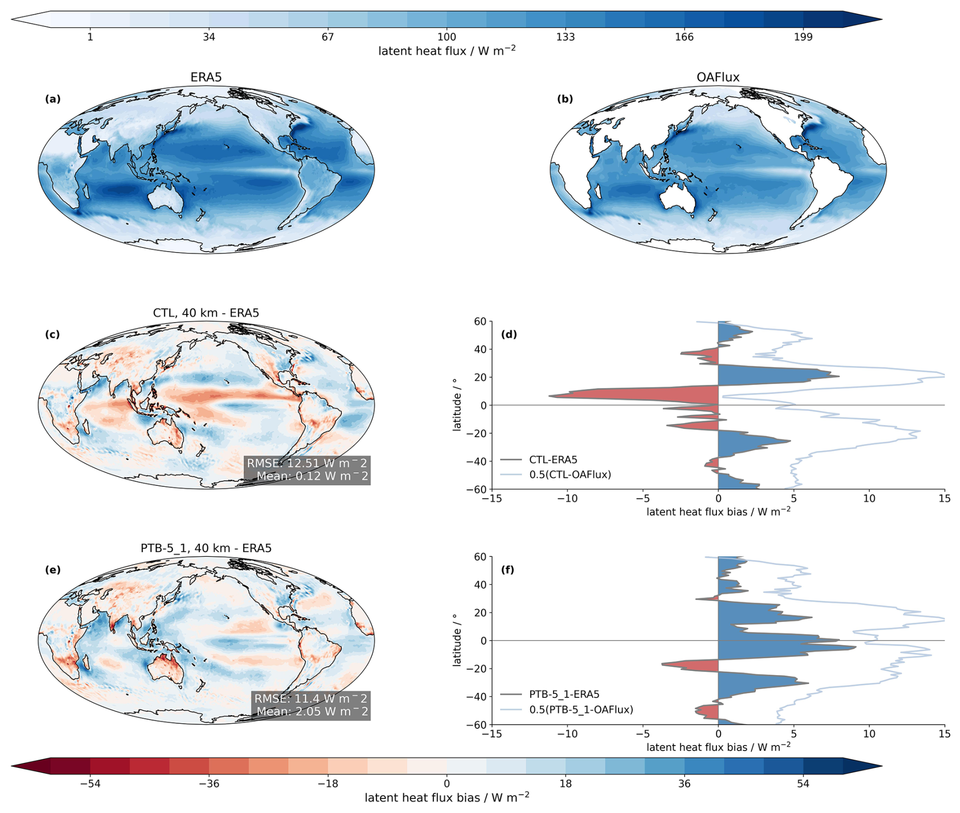 Figure 8Latent heat flux in reanalysis and 40 km simulations. (a) ERA5 multi-year average latent heat flux for the years 2004–2010. (b) OAFlux multi-year average latent heat flux for the years 2004–2010. Two-year mean large-scale latent heat flux change with respect to ERA for CTL and PTB-5_1 (c–f). The left column shows global biases, the right column the zonal mean bias with respect to ERA5 (land and ocean) and OAFlux (ocean only).