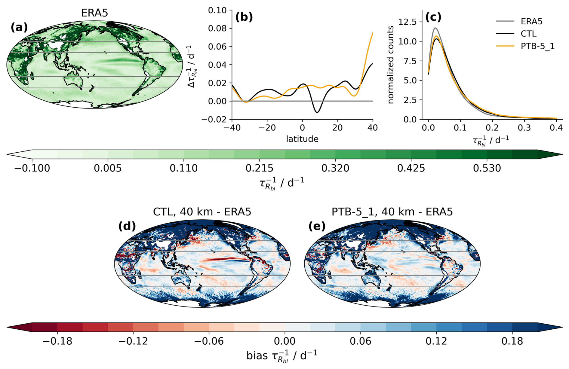 Figure 9Inverse residence time within the boundary layer up to 850 hPa: (a) ERA5 for the reference years 2004–2010, and differences of two-year average of CTL (d) and PTB-5_1 (e) compared to ERA5. The gray lines mark the 40 and 20° latitudes. (b) Difference of zonal distribution of of CTL and PTB-5_1 to ERA5 within the latitude band between 40° S and 40° N, restricted to ocean only. (c) Probability density function of of ERA5, CTL and PTB-5_1 within the latitude band between 40° S and 40° N, restricted to ocean only.