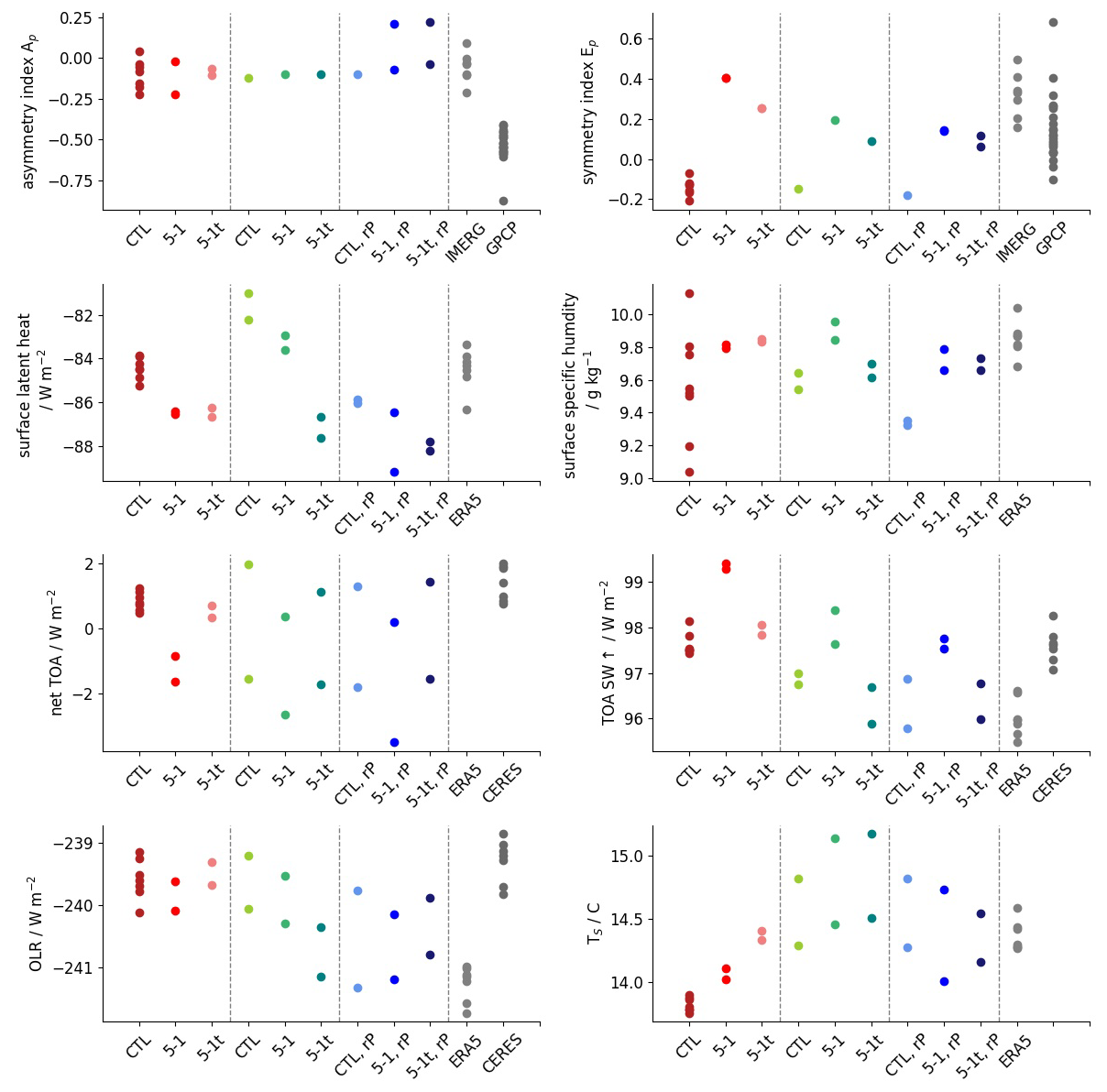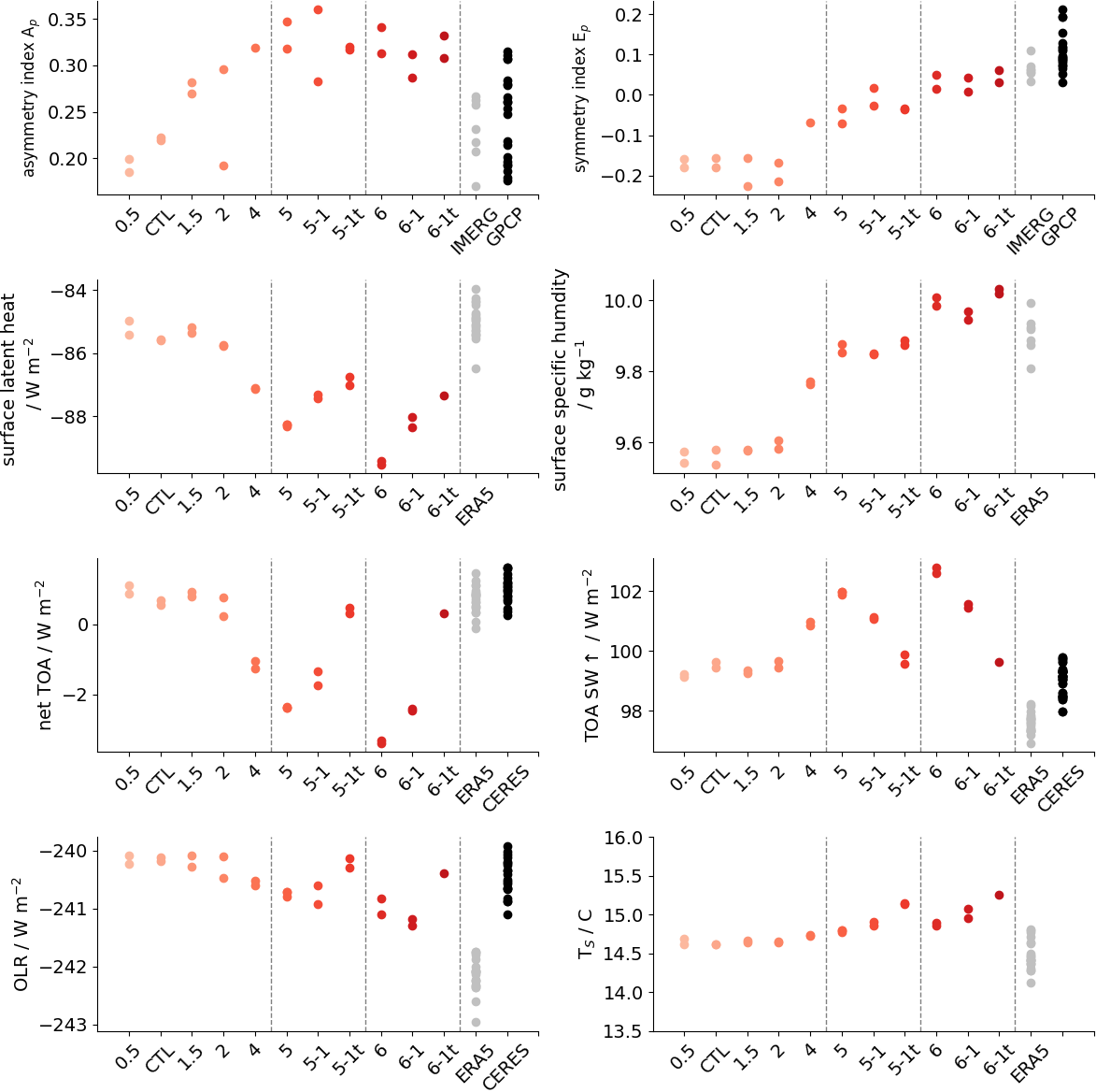 Figure 14Simulation scores for two MAM seasons of CTL, PTB-5_1 and PTB-5_1t sensitivity experiments in the 40, 5 and 5 km-rParam setup. The 40 km scores are shown in different shades of red, the 5 km setups in shades of green and the 5 km-rParam in different shades of blue. Values for the asymmetric index Ap, symmetry index EP as well as latent heat flux, near-surface specific humidity qs, net top-of-the-atmosphere (TOA) imbalance, upwards radiative shortwave flux, outgoing long wave radiation (OLR) and global mean near-surface temperature TS are shown. Each point depicts a one season average. For reference the corresponding values from IMERG, GPCP, ERA5 and CERES are listed.