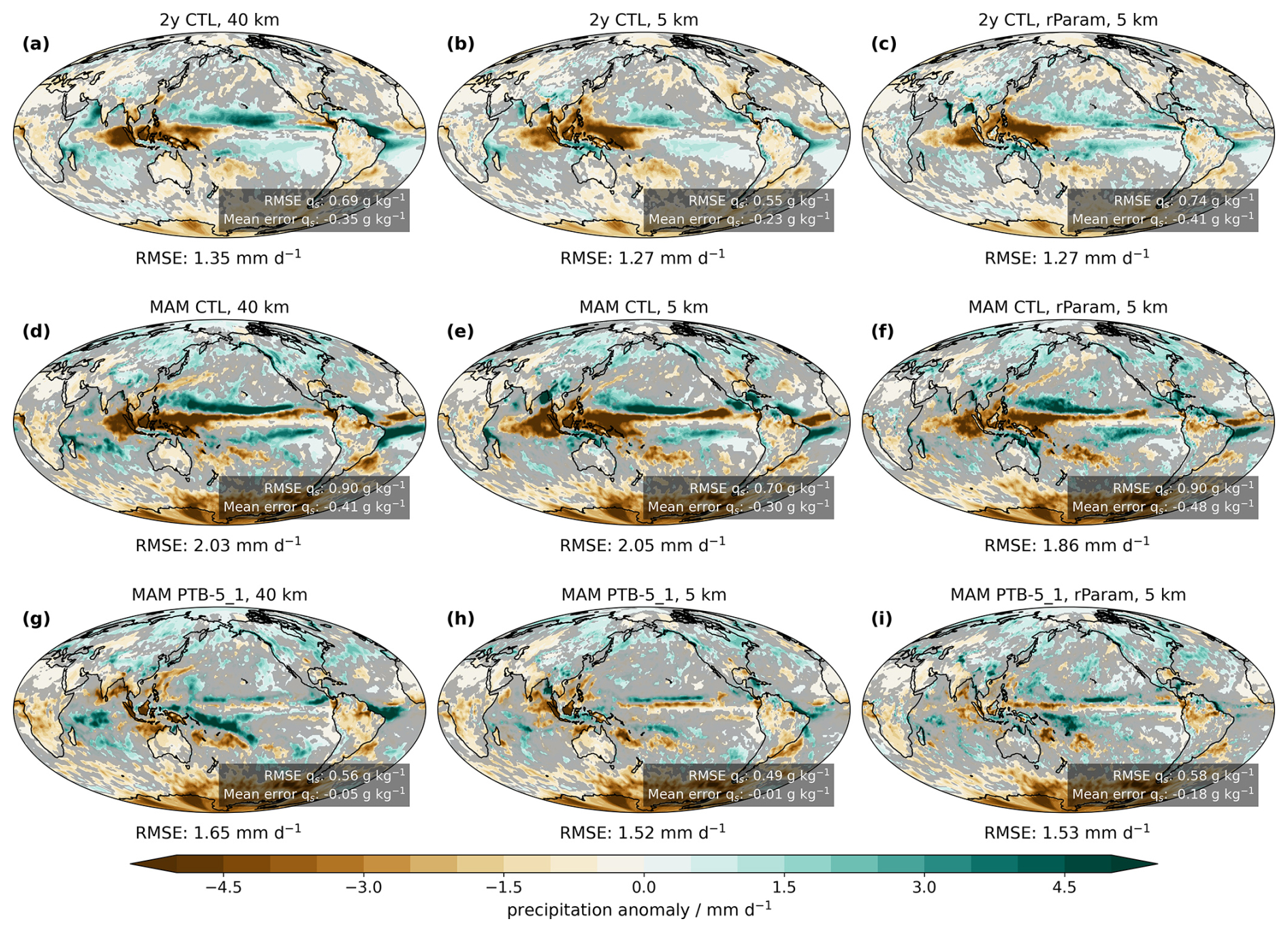 Figure 11Large-scale precipitation bias with respect to IMERG in: 2-year averages from CTL simulations (a–c), two-MAM averages from CTL simulations (d–f) and two-MAM averages from PTB-5_1 simulations (g–i) for 40, 5 and 5 km-rParam. The corresponding global precipitation RMSE is indicated below the panel for each experiment. Statistically insignificant differences between IMERG and the experiments are shown based on a two-sided z-test at α=0.1, and insignificant regions are grayed out. The global RMSE and mean error in the near-surface specific humidity, calculated with respect to the values derived from the ERA5 reanalysis, are shown in the inlays.