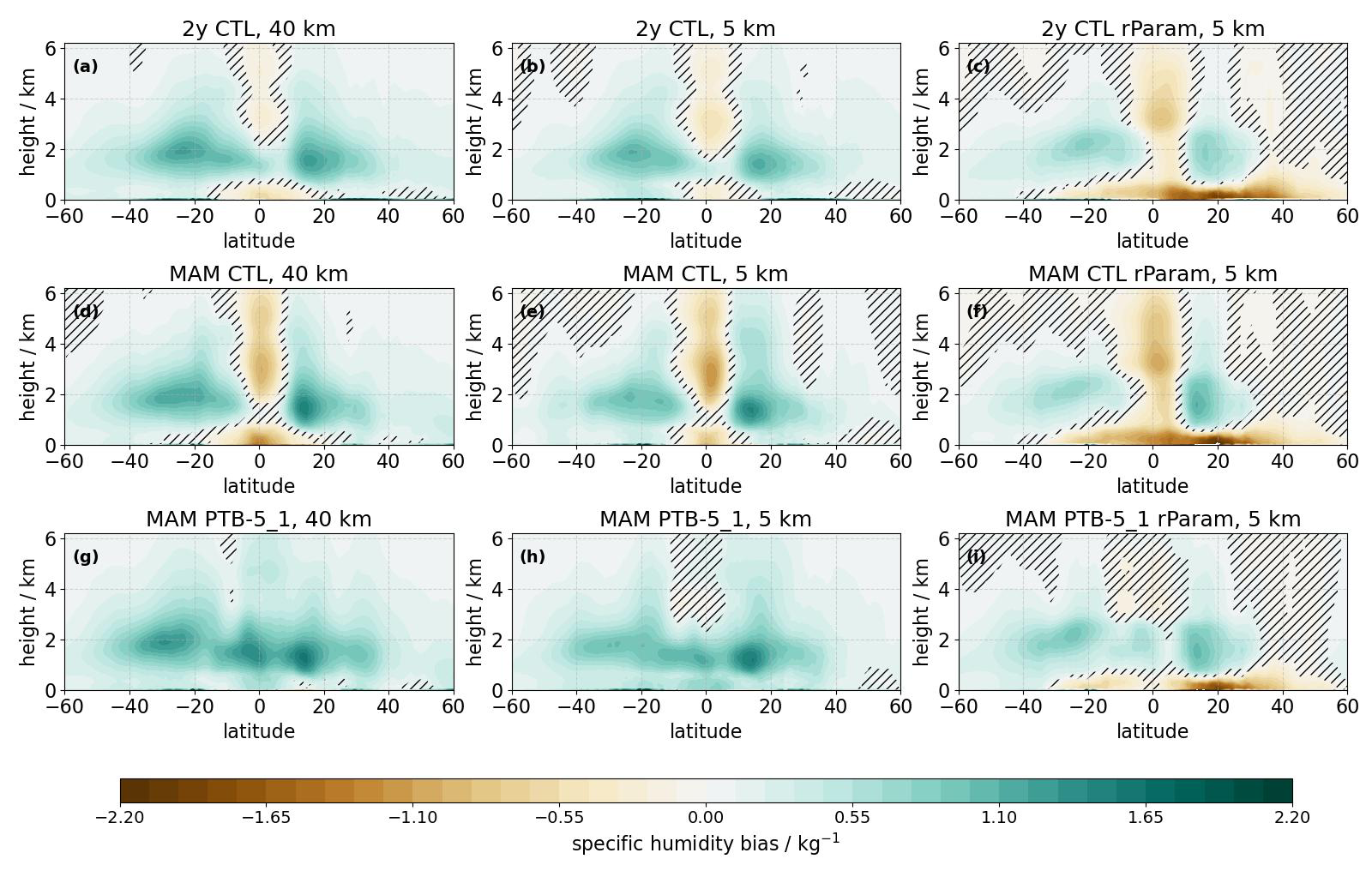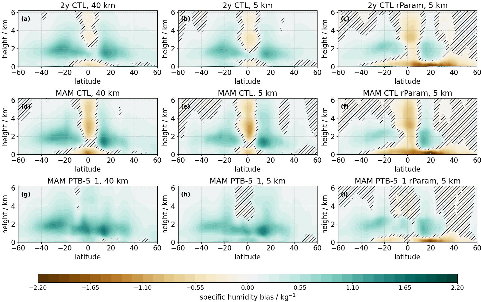 Figure 12Atmospheric specific humidity bias with respect to ERA5: all CTL for a 2 year average (a–c), all CTL for an average over two MAM seasons (d–f) and all PTB-5_1 for an average over two MAM seasons (g–i) for 40, 5 and 5 km-rParam. Statistically significant differences between ERA5 and the model data are shown, insignificant regions are hatched.