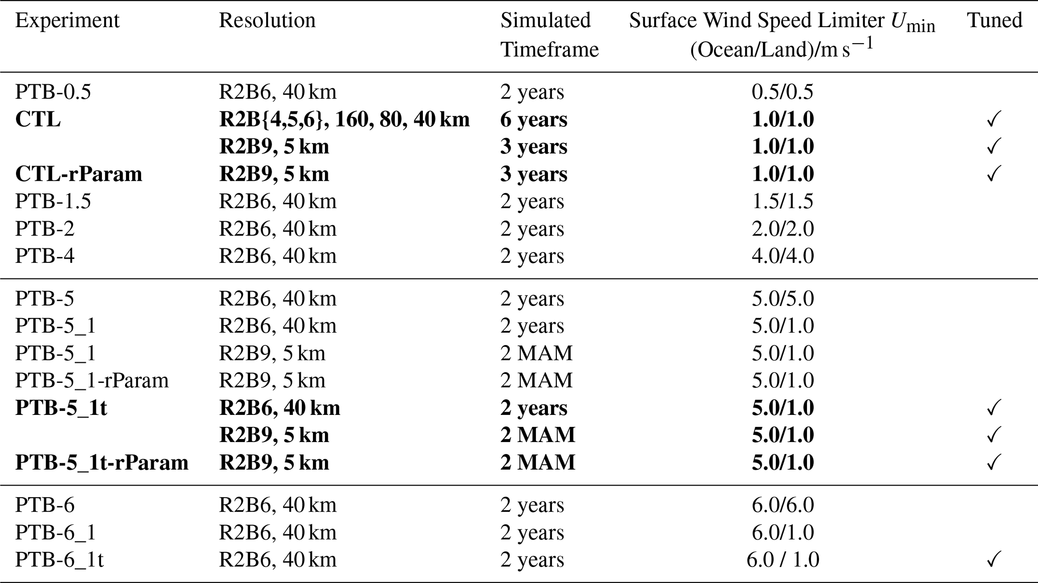 Table 1Summary of Experiments: Experiment acronyms, employed resolutions, simulated timeframe, setting for the minimum horizontal wind speed over ocean/land and tuning. The control simulation (CTL) run for all resolutions and the best-performing perturbation experiment (PTB) for the large-scale precipitation representation are marked bold. The runs with the reduced set of parameterizations are labeled as rParam. Resolution is given in terms of the ICON grid used and the corresponding horizontal grid spacing.