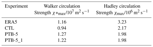 Table 2Walker and Hadley circulation strengths for ERA5 as well as CTL, PTB-5 and PTB-5_1. Indices are calculated following the approach by Tanaka et al. (2004) as described in Sect. 2.5.