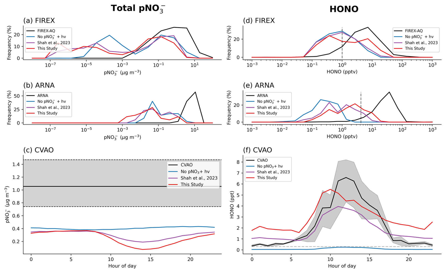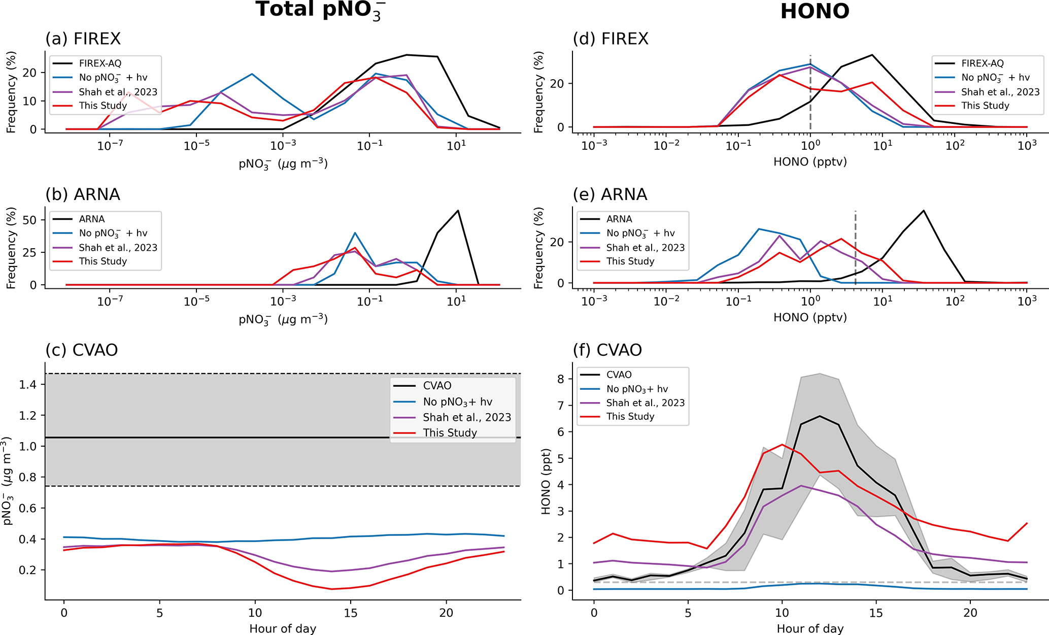 Figure 2Frequency density comparisons between observed (black) and simulated (Base simulation (blue); Shah simulation (purple); New parameterization (red)) total (coarse and fine mode) pNO3- (left) and HONO (right) concentrations during the FIREX-AQ campaign (top) and the ARNA campaign (middle). Bottom panels show simulated diurnal concentrations over the Cabo Verde Atmospheric Observatory (CVAO) compared to available observations (HONO diurnal averaged from campaigns in 2015, 2019 and 2023 represented by the black line, grey shading indicating 10th–90th percentile in panel c, 25th-75th percentile in panel f). Dashed grey lines in panels (d), (e) and (f) represent the estimated limit of detection.