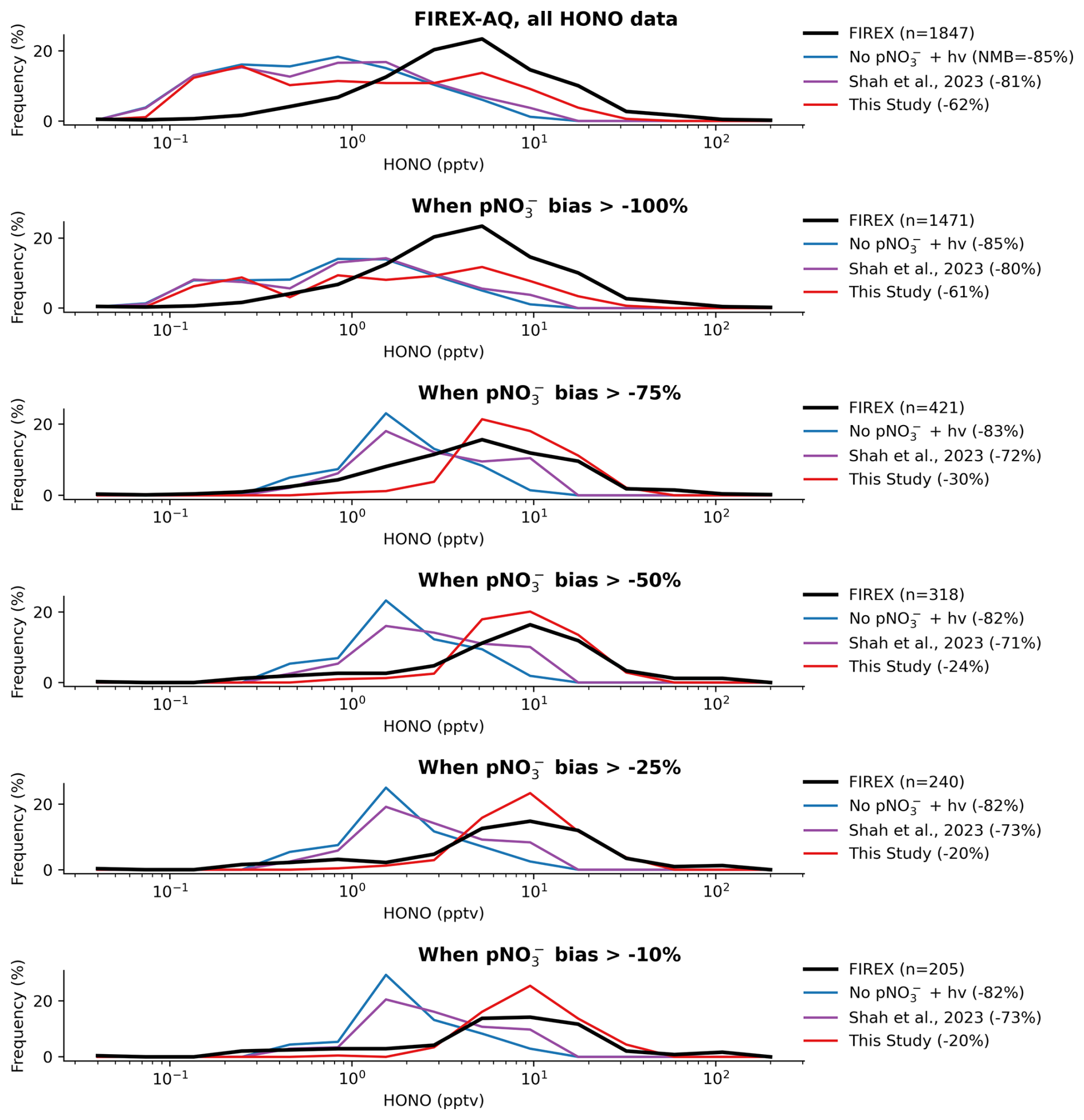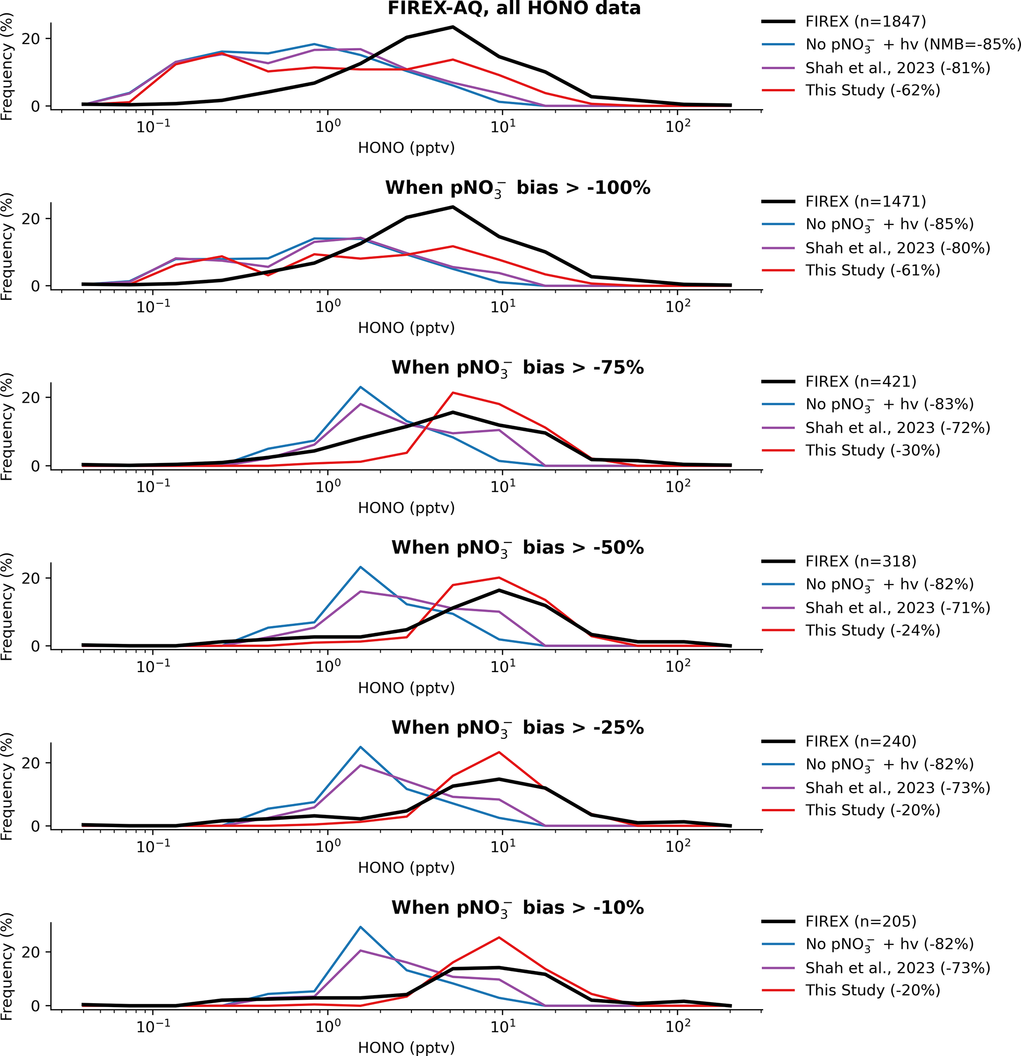 While the inclusion of nitrate photolysis increases HONO concentrations, there remains a daytime underestimate of HONO relative to each of these datasets. This is likely due to the model being biased low for total nitrate concentrations, and thus the model HONO production being too low. To test this hypothesis, we further evaluated the HONO in the FIREX-AQ dataset, subsampling the entire dataset when the model shows various degrees of underestimate in pNO3- (Fig. 4). When sampling the entire FIREX-AQ dataset, the new parameterization reduced the model HONO underestimate by around a quarter (85 % to 62 %). When ignoring data points where the simultaneous pNO3- measurement had a low bias of > 75 %, the HONO bias of the new simulation improved to 30 %, while the bias in the Base and Shah simulations showed only very minor changes. The best agreement (NMB of 20 %) was found with the new parameterization when only considering data with a pNO3- underestimate of less than 25 %. This demonstrates that the new parameterization is capable of reproducing measured HONO concentrations reasonably accurately when modelled pNO3- is close to observations and that the main limiting factor for the model simulation of HONO is the pNO3- bias. It was not possible to replicate this analysis for the ARNA and CVAO datasets due to the amount of data available.