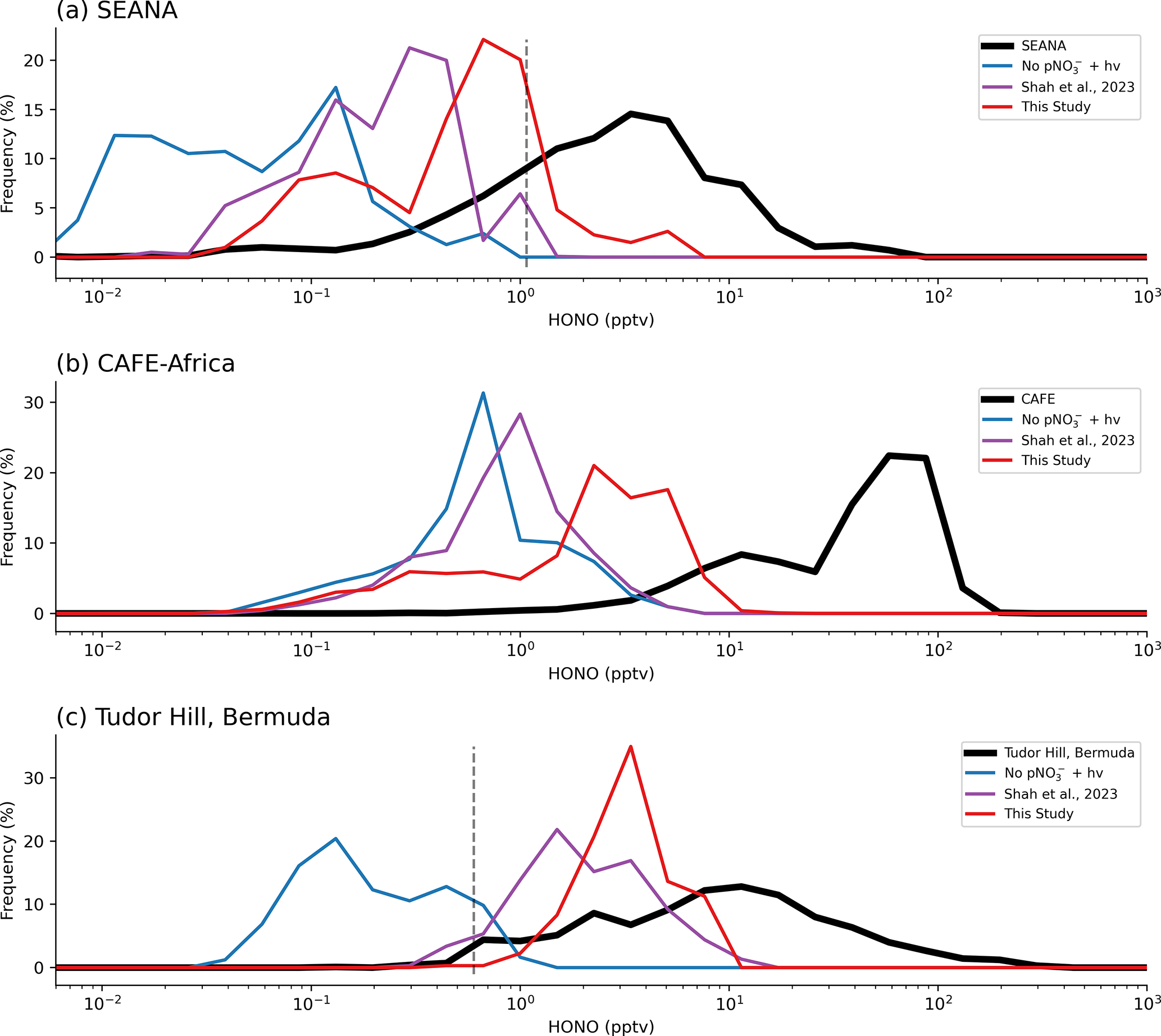 Figure 5Frequency density comparisons between observed and simulated HONO concentrations during the (a) SEANA ship campaign (surface), (b) CAFE-Africa aircraft campaign and (c) in-situ measurements from Tudor Hill, Bermuda (surface) (Zhu et al., 2022). Dashed grey lines represent the estimated limit of detection.
