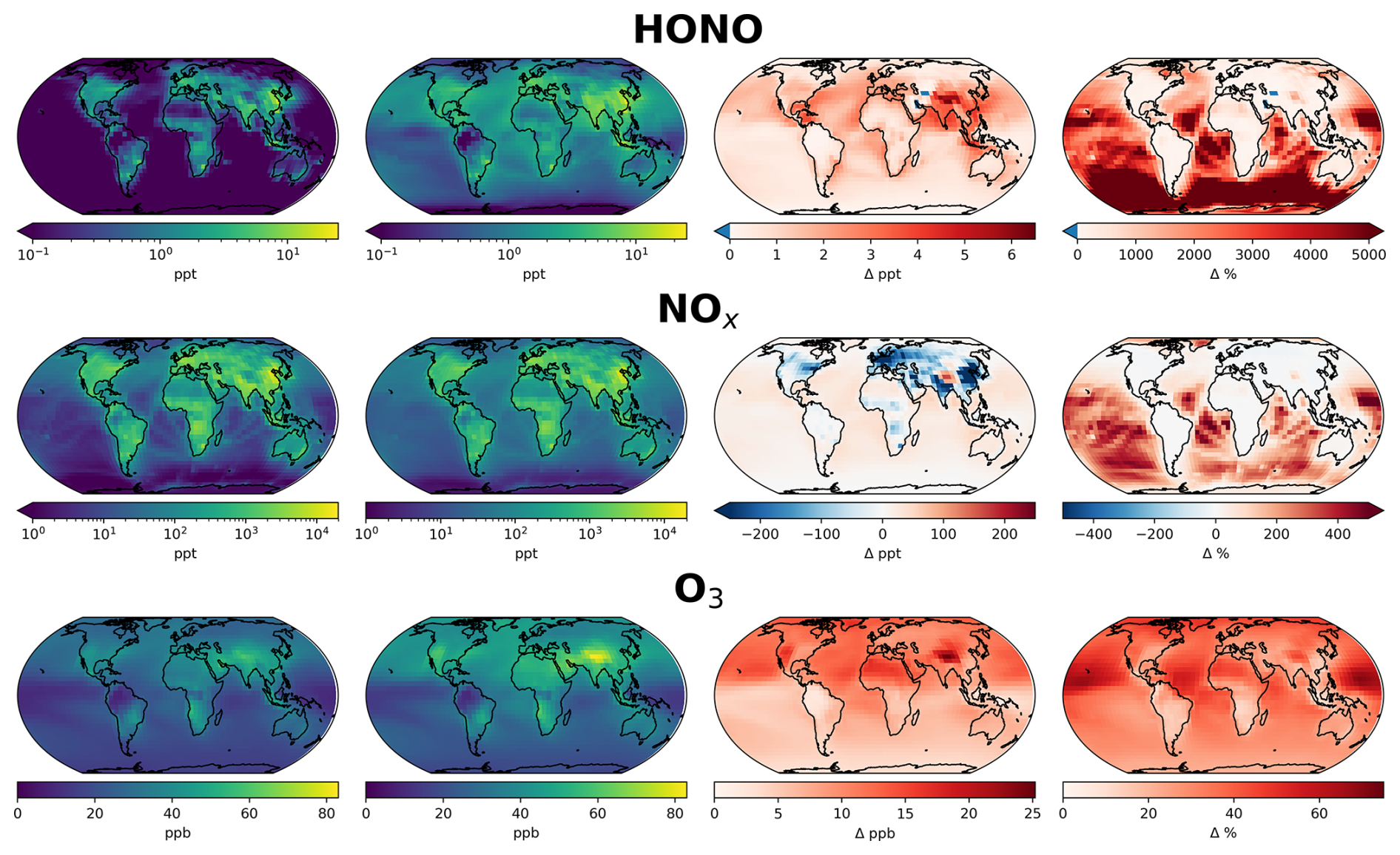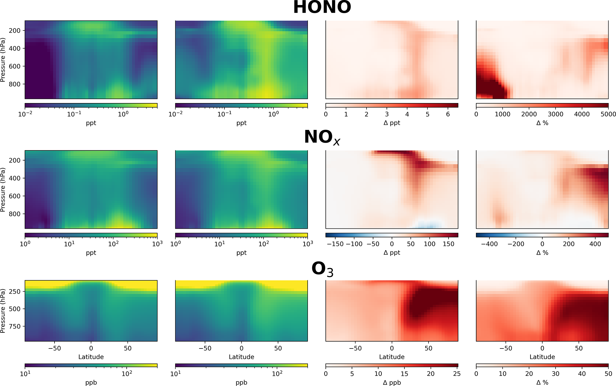 Figure 7 shows the impact of the new parameterization on global annual mean surface concentrations of HONO, NOx and O3. Figure 8 shows the equivalent zonal mean plots. Surface HONO concentrations increase globally when the new nitrate photolysis parameterization is switched on, with maximum increases in mean surface concentrations of  4–6 ppt found over Asia. Absolute increases are generally higher in the populated NH areas and relative changes are larger over clean regions such as the Southern Ocean and tropical Atlantic/Pacific. Figure 9 shows the same as Fig. 7 but for HNO3, pNO3- and OH. As expected, surface pNO3- broadly decreases in remote regions, while HNO3 and OH increase substantially.