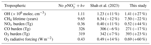 Table 1Summary of key model diagnostics in the 3 GEOS-Chem simulations (percentage change from first simulation is in brackets).
