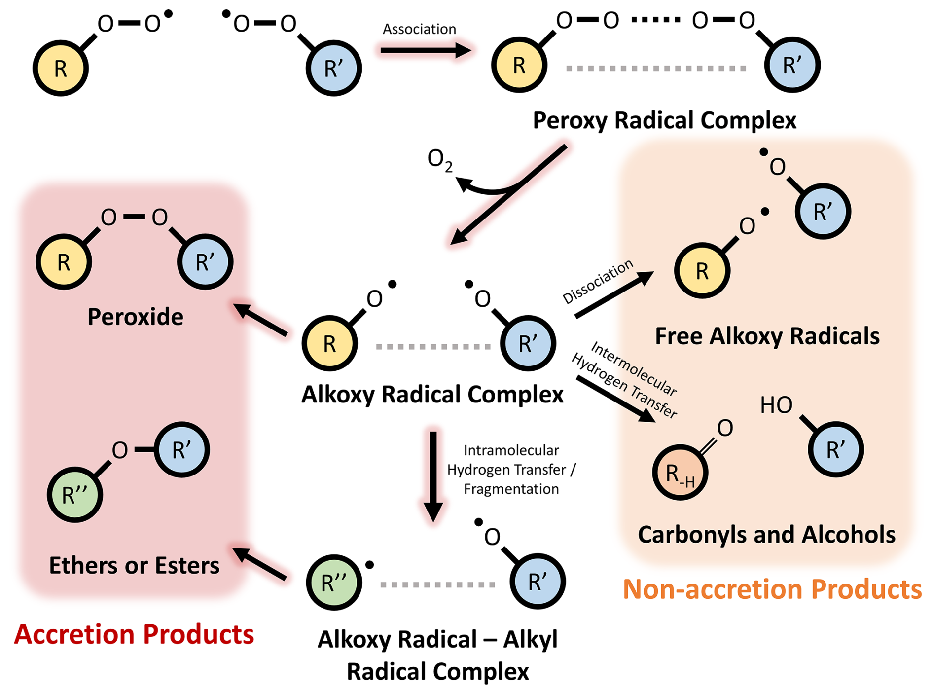 Atmospheric aerosol, solid or liquid particles suspended in the atmosphere, has important negative impacts on human health, as well as influencing the Earth's radiative balance (Forster et al., 2021; Hallquist et al., 2009). Secondary organic aerosol (SOA) has been shown to comprise a substantial fraction of measured aerosol in a range of environments (Camredon et al., 2010; De Gouw and Jimenez, 2009; Hallquist et al., 2009; Zhang et al., 2007; Ziemann and Atkinson, 2012). Previous work has shown that covalently bonded dimer species, formed either through gas or particle-phase processes, can contribute to SOA mass (Kenseth et al., 2018; Zhang et al., 2015). One important formation pathway to form dimer species is the gas-phase cross-reactions of peroxy radicals (RO2). The dimer products of these RO2 cross reactions are often termed `accretion products' due to the possibility to form oligomeric products from sequential oxidation (Hallquist et al., 2009). Evidence of RO2 accretion products have been found in a range of chamber and flow-tube experiments conducted with a variety of volatile organic compound (VOC) precursors and oxidant conditions (Berndt et al., 2015; Ehn et al., 2014; Mettke et al., 2023; Peräkylä et al., 2023). Further mechanistic evidence for RO2+ RO2 accretion reactions comes from theoretical calculations demonstrating that this can be a competitive fate for RO2 − RO2 complexes, as opposed to the formation of free alkoxy radicals (RO) or the formation of alcohols and carbonyls (Hasan et al., 2020, 2021; Salo et al., 2022; Valiev et al., 2019). Recent experimental and theoretical work has also suggested that in-complex RO fragmentation can result in the formation of ether or ester accretion products with fewer carbon atoms than the sum of the two peroxy radicals, as opposed to the more commonly considered organic peroxides (Fig. 1) (Franzon et al., 2024; Peräkylä et al., 2023). The use of the term `RO2 accretion products” in this work refers to dimer species with peroxide, ester, and ether linkages formed through RO2 cross reactions.