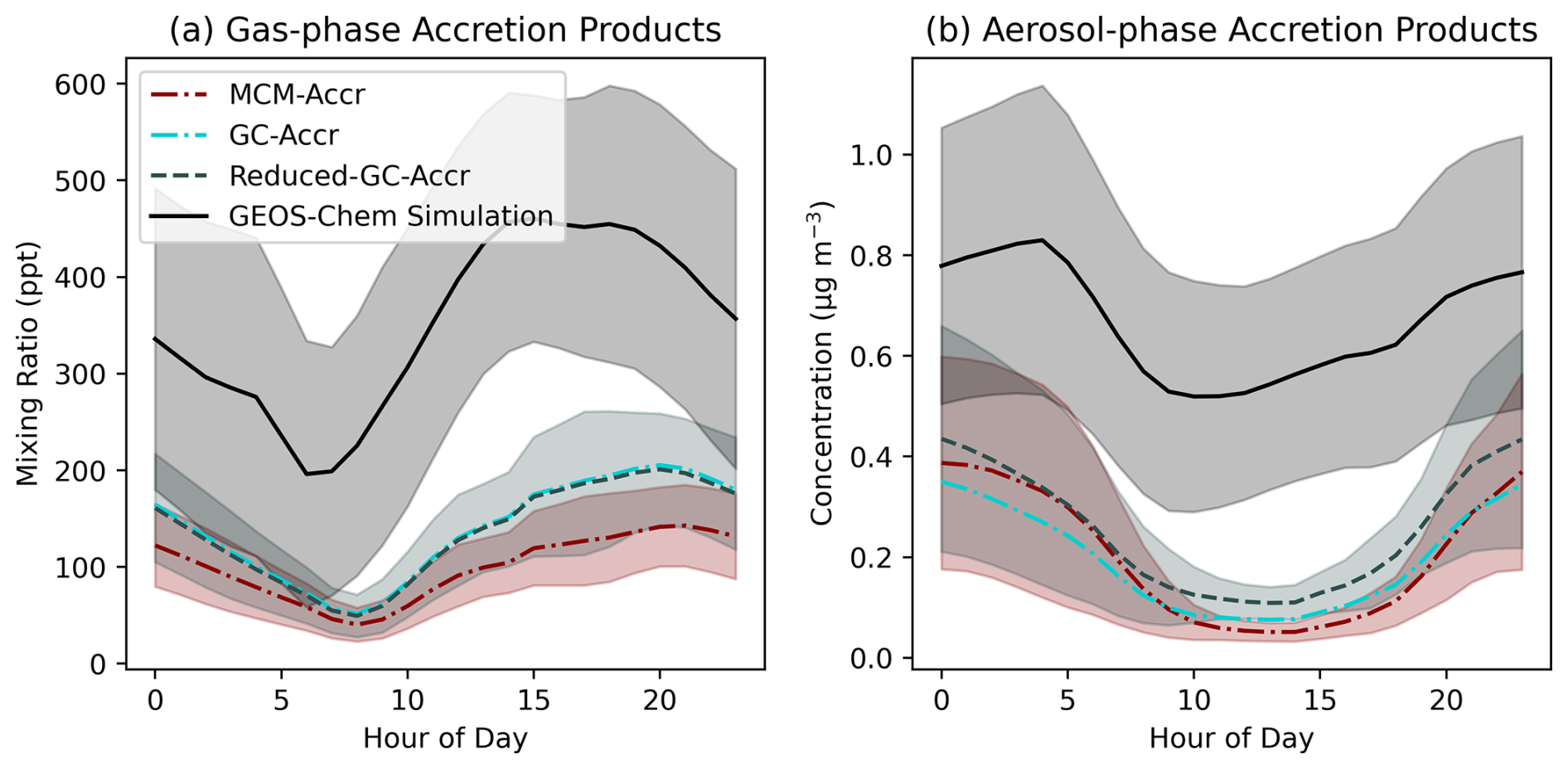 Figure 2Accretion product mixing ratios in each of the SOAS box model simulations and the GEOS-Chem simulation output. (a) Gas-phase accretion products, (b) Aerosol-phase accretion products. Lines represent the hourly mean mixing ratio and shaded areas show one standard deviation above and below the mean.