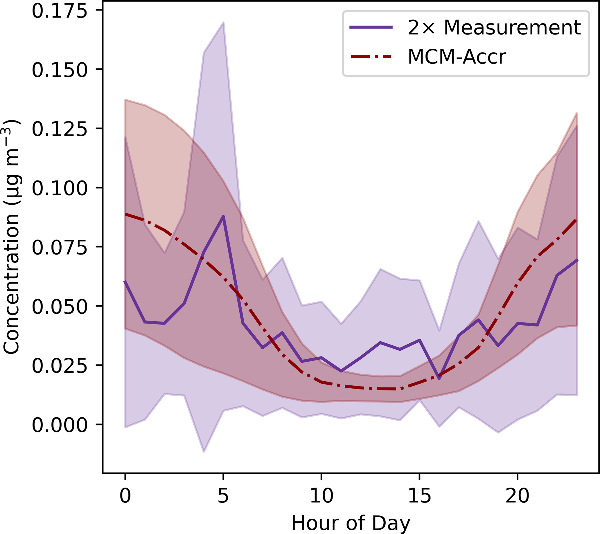 Comparison between the SOAS box model results and the measurements made with FIGAERO-CIMS allows for an approximate assessment of the accuracy of the modelled accretion product concentrations. As noted in previous work, the calibration of I−-CIMS can vary by orders of magnitude depending on the structure of organic compounds (Lee et al., 2014; Mayhew et al., 2022), making it difficult to provide an accurate comparison between the modelled and measured accretion products, for which no calibration standards are available. Suspected accretion products detected with the I−-CIMS were calibrated using a maximum sensitivity approach, meaning the reported concentrations are the minimum possible concentration corresponding to the measured signal. This is potentially amplified by the possibility of thermal decomposition of some species, resulting in lower measured concentrations. The ratio of the mean modelled concentration and mean measured concentration was calculated for each identified accretion product signal over the course of the measurement campaign. These campaign-average ratios showed that the mean ratio value was 4.6, the median 1.6, the maximum 37, and the minimum 0.015. 19 of the 41 signals used in this analysis shows an average model-to-measurement ratio over the course of the campaign of less than one, with 14 showing an average ratio of less than 0.5, indicating an underprediction for these species against the maximum sensitivity calibration used. Accounting for the relative abundance of each accretion product, by calculating the total sum of the concentration of selected accretion products in the models and measurements, demonstrates that the modelled concentrations are generally around two times larger than the measurement (Figs. 3, S8). The mean ratio over the course of the campaign is much higher than 2, at 14.9, because of a large over-prediction between the 25 and 29 June. The median ratio is 2.17 and the root-mean-squared error, normalised to the mean measured value (NRMSE), is 1.97. This offset of two times is consistent with the maximum sensitivity calibration and is within the range of sensitivity differences for organic species measured by I−-CIMS (Lee et al., 2014). However, it should be highlighted that the uncertainties in such calibrations preclude an accurate analysis of the model's ability to predict accretion product concentrations. The diurnal average profile of the measured and MCM-Accr data show similar trends, with higher night-time concentrations. However, the modelled diurnal is stronger than that observed with I−CIMS. This may suggest that the representation of physical processes in the box model are either removing species to quickly during the day, or not quickly enough at night, particularly for aerosol-phase accretion products.