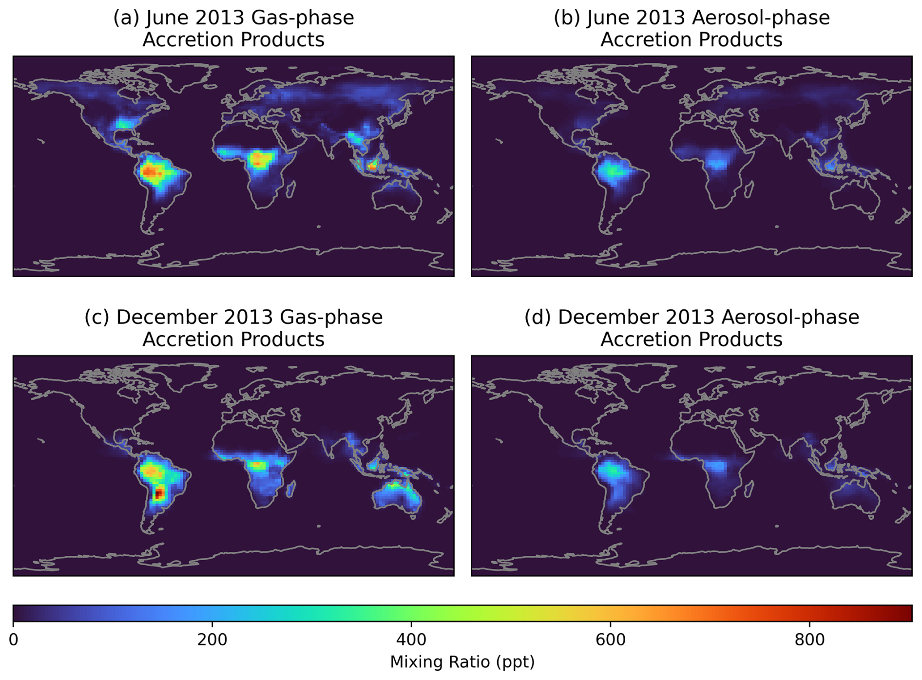 Figure 4 shows the simulated accretion product mixing ratios in the gas and aerosol phases in the modified GEOS-Chem simulation. This figure demonstrates that the south-eastern USA (used as the focus for the box modelling) does show globally high accretion product concentrations, but that remote tropical forested regions exhibit the largest concentrations in both the gas and aerosol phases. For example, Amazonia, Central Africa, and Borneo show average gas-phase accretion product mixing ratios of over 0.6 ppb, and aerosol-phase mixing ratios of around 200 ppt. Analysis of accretion product concentrations over Amazonia during the GOAMAZON period (Fig. S9) show a similar diurnal profile as the SOAS campaign (Fig. 2), with higher concentrations overnight and a minimum in gas-phase concentrations in the early morning, when NO concentrations spike.