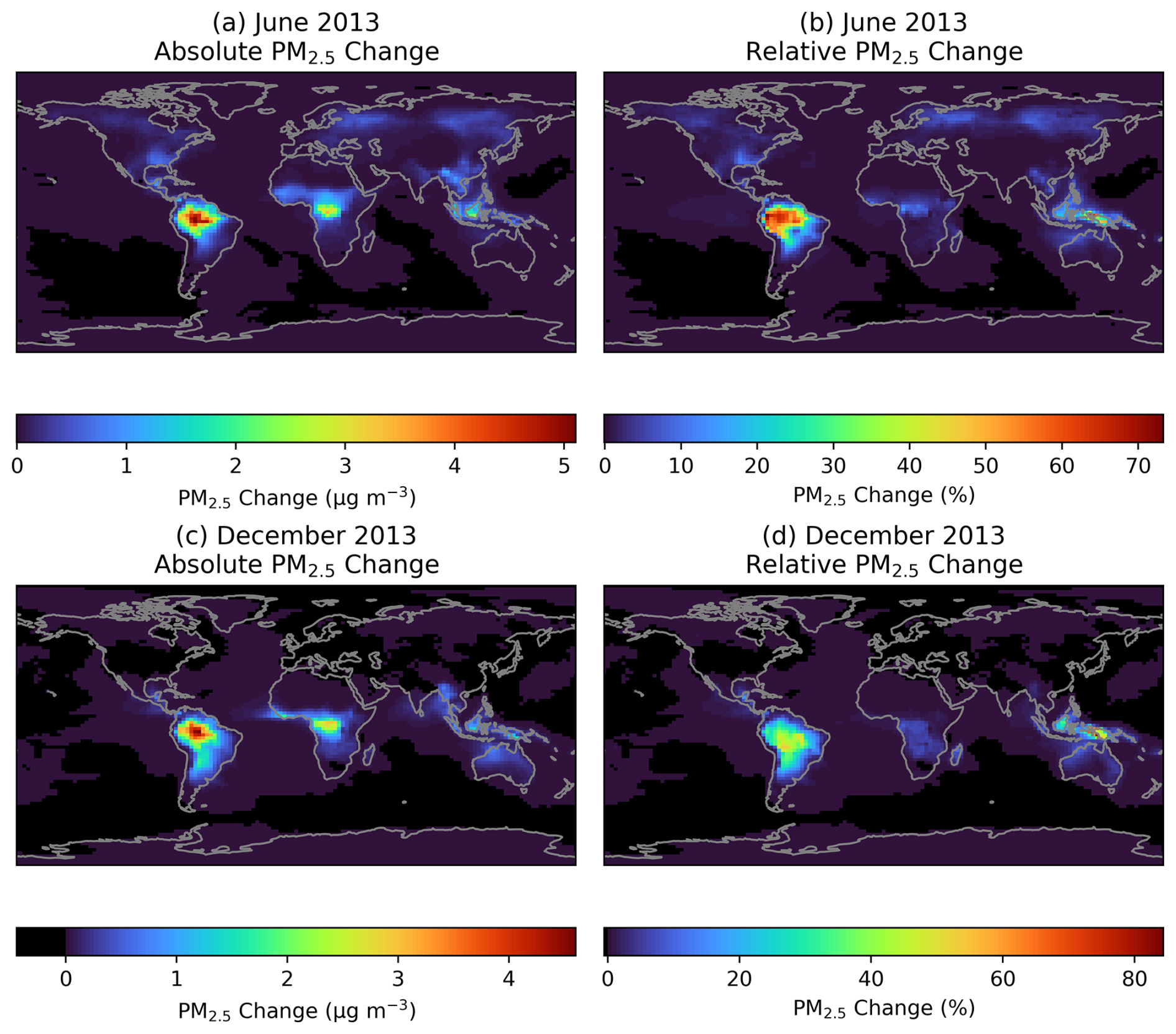 Figure 5The change in monthly average ground-level PM2.5 concentrations when adding RO2 accretion reactions to GEOS-Chem. (a) and (c) show the absolute change in ground-level PM2.5 mass concentration in June and December, respectively. (b) and (d) show the change as a percentage of ground-level PM2.5 in the base model in June and December, respectively.
