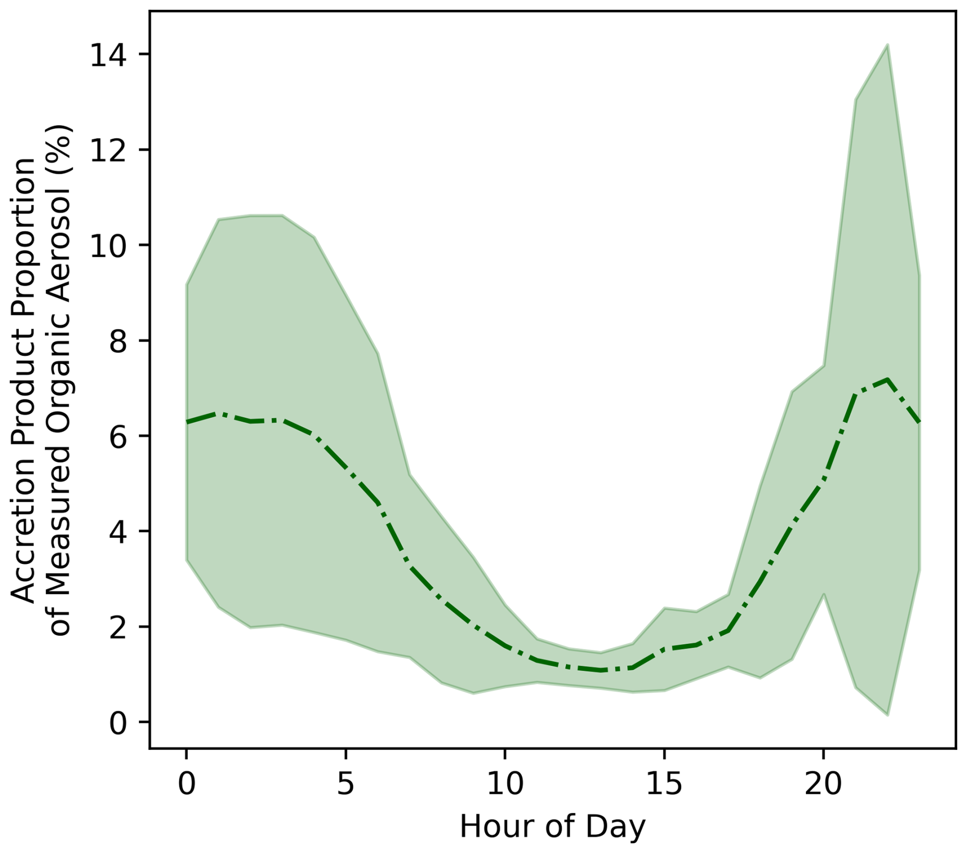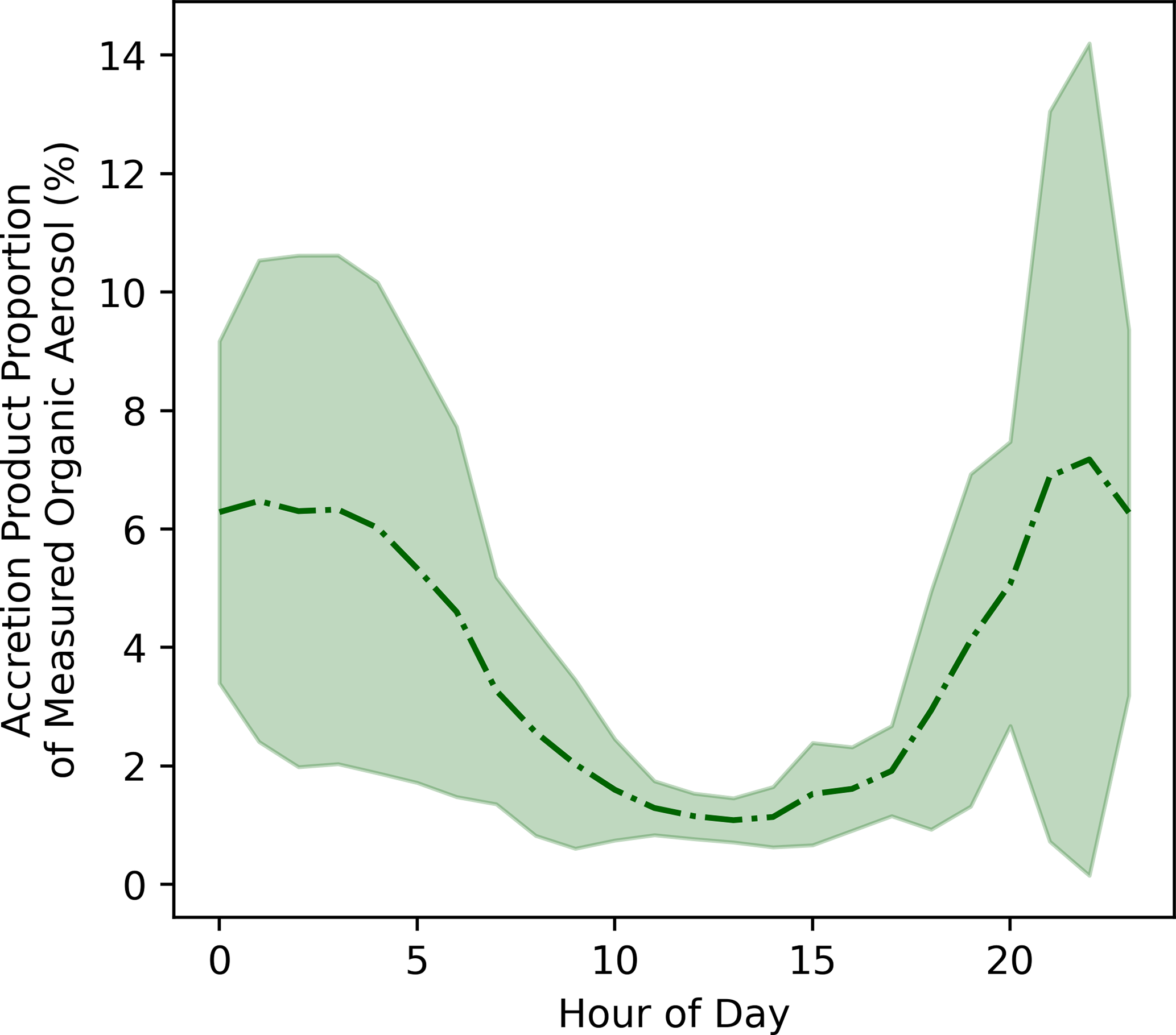 Figure 6Proportion of measured organic aerosol estimated to be comprised of accretion products in the MCM-Accr SOAS box model simulations, calculated by taking the ratio of the modelled accretion product concentration and the AMS measured OA. Lines represent the hourly mean mixing ratio and shaded areas show one standard deviation above and below the mean.