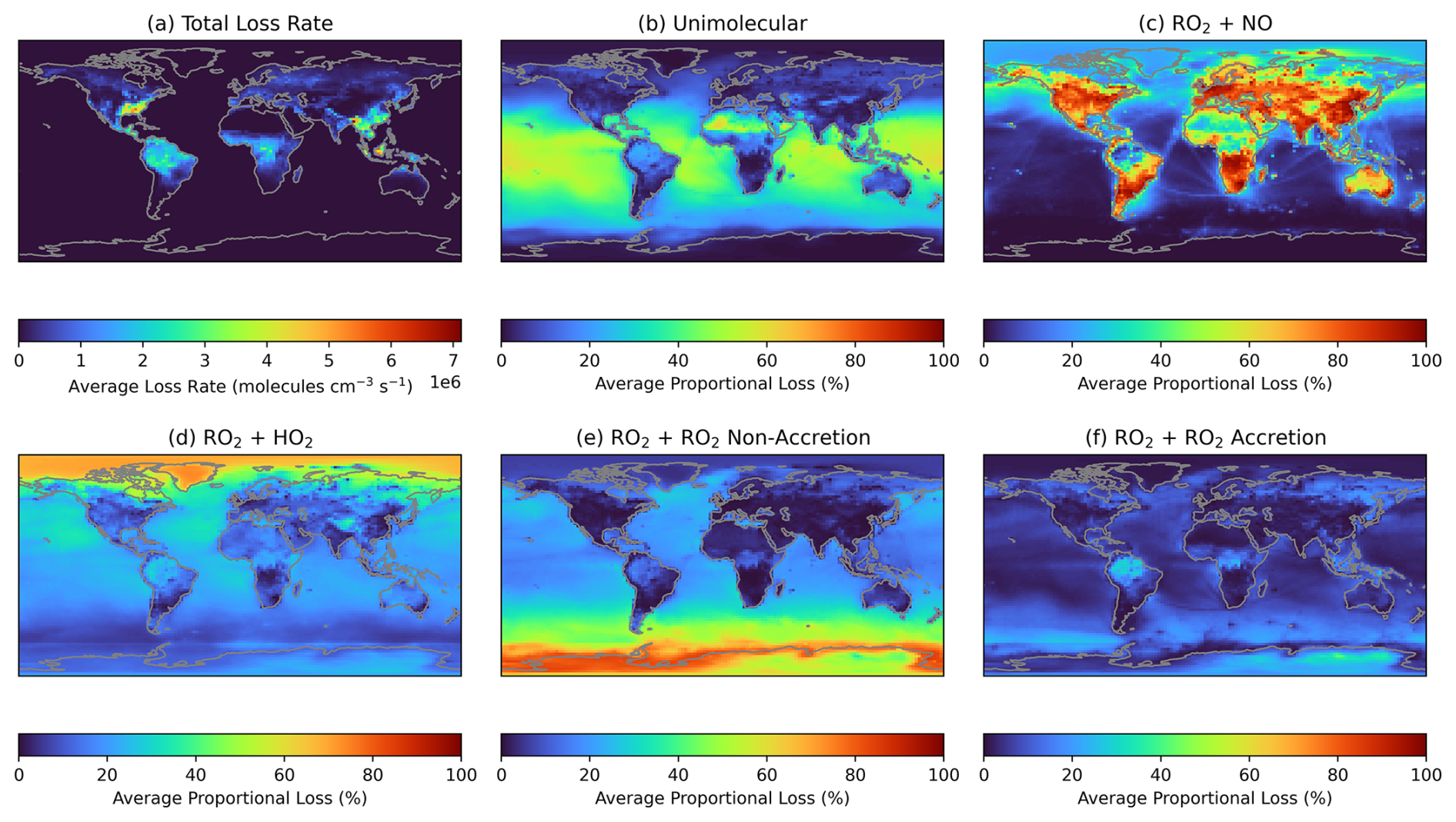 Figure 8(a) Average total loss rate of the primary isoprene RO2, IHOO1, during June of the GEOS-Chem simulation. (b)–(f) Average fractional loss of IHOO1 to each loss pathway, independent of RO2 concentration.