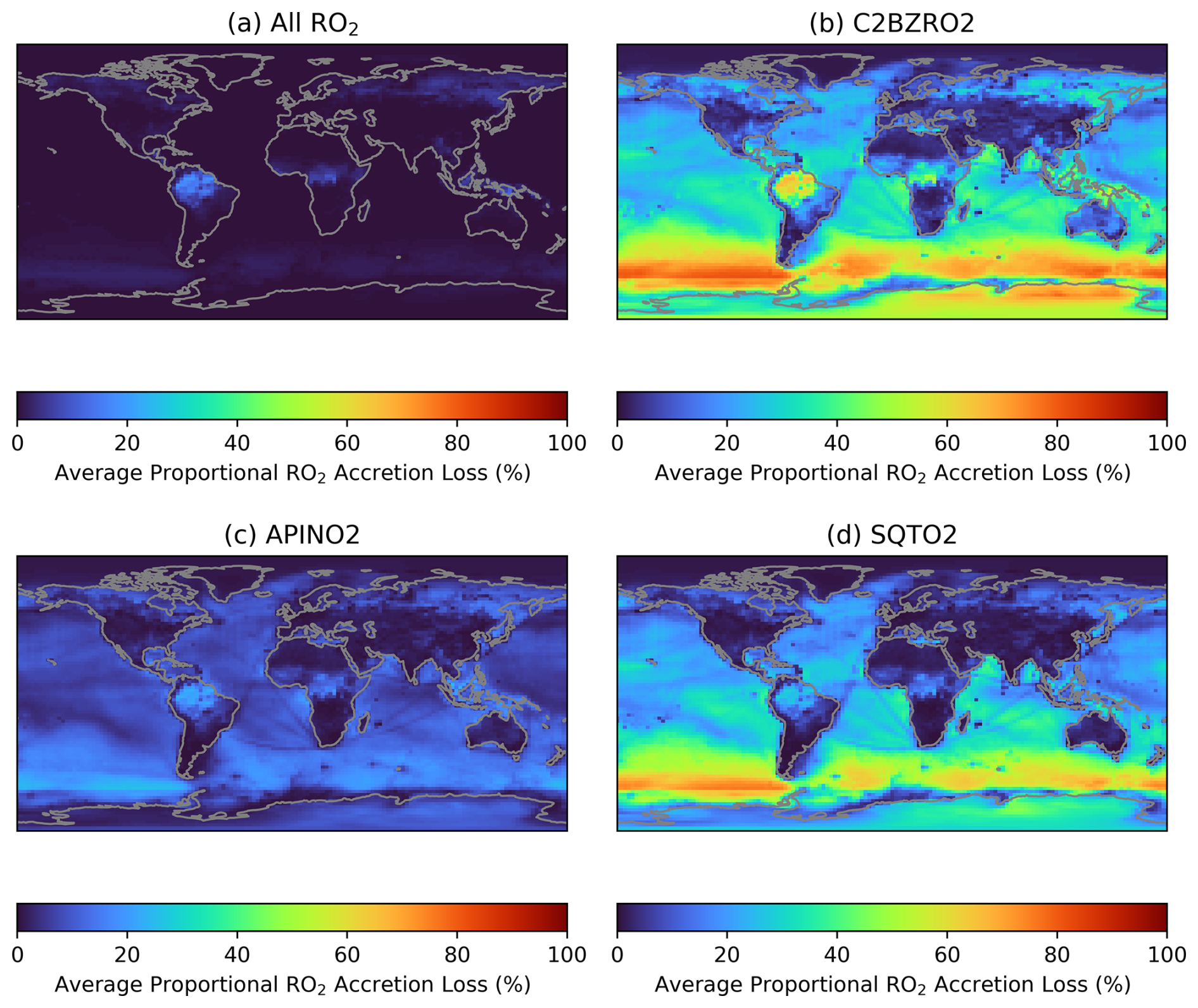 Figure 9 shows the average fractional loss of a series of RO2 categories to accretion reactions in June (December data is shown in Fig. S15). The categories are: all RO2; a primary aromatic RO2 from styrene and ethyl benzene (C2BZRO2, see Sect. 2.1); a primary α-pinene RO2 (APINO2); and a primary sesquiterpene RO2 (SQTO2, see Sect. 2.1). The panels in Fig. 9 are analogous to Fig. 8f for IHOO1, though it should be noted that unimolecular losses are not included for any of the listed RO2 which will result in an overestimation of the proportion of RO2 lost to accretion reactions if unimolecular reactions are occurring in the real world. The accretion reactions comprise a small proportional of the total RO2 loss (Fig. 9a) since the C1 methylperoxy radical (MO2), which is the most prevalent RO2, doesn't participate in any of the added accretion reactions due to slow predicted rates (Franzon et al., 2024). This demonstrates the importance of RO2 accretion reactions in SOA formation despite the potential for RO2 accretion reactions to comprise a small proportion of total RO2 loss. In contrast, a high proportion of C2BZRO2, APINO2, and SQTO2 are lost to accretion reactions (Fig. 9b–d). The higher mass of these C8-C15 RO2 species compared to IHOO1 better facilitates accretion product formation, but also means that the lower volatility-accretion products are more likely to partition into the aerosol-phase and contribute to SOA.