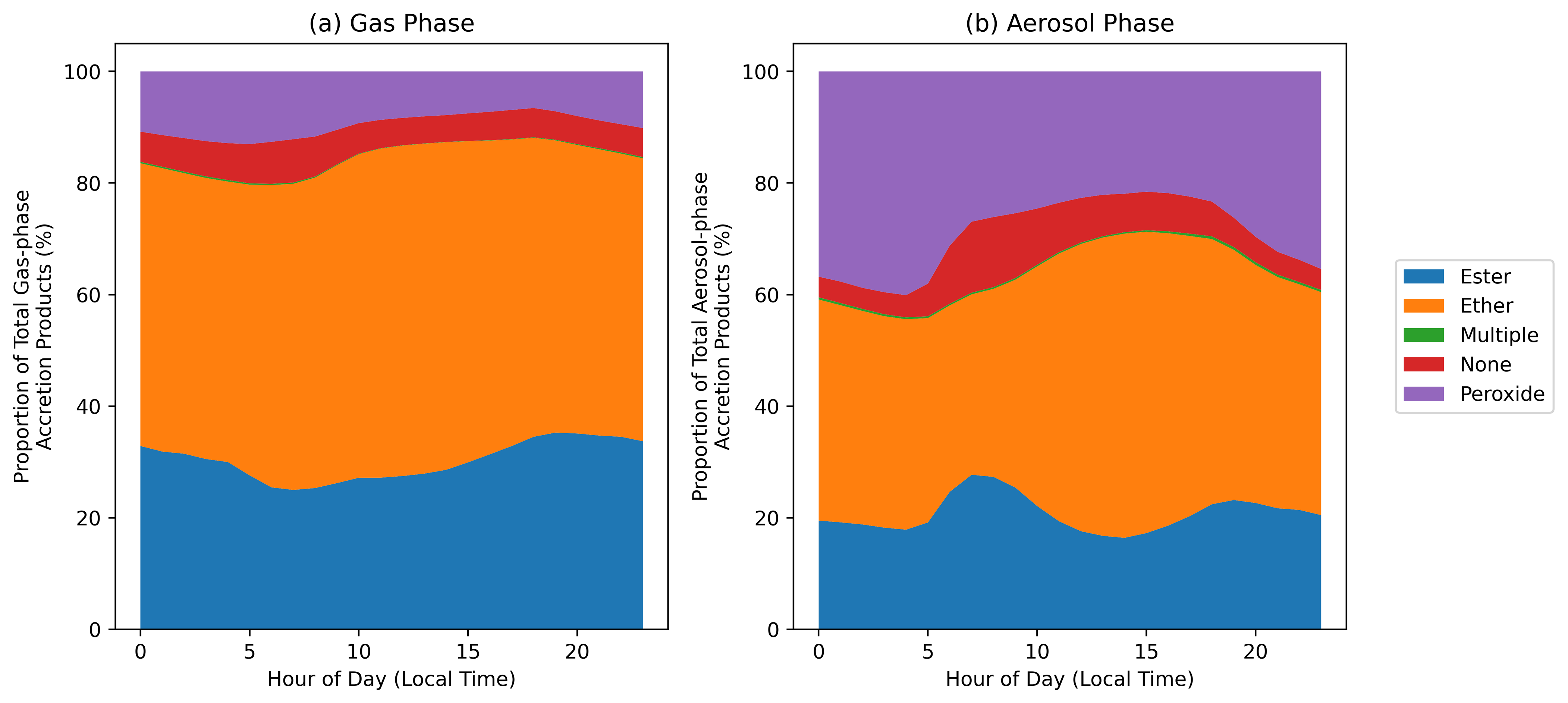 Figure 10Hourly mean proportion of accretion products with ester, ether, or peroxide functionality in the MCM-Accr SOAS box model. “Multiple” includes accretion products with any combination of the three functional groups. `None' refers to products with none of the functional groups (due to unstable product radicals, as discussed in the Methods section). (a) shows the composition of gas-phase accretion products, (b) shows the composition of particle-phase accretion products.