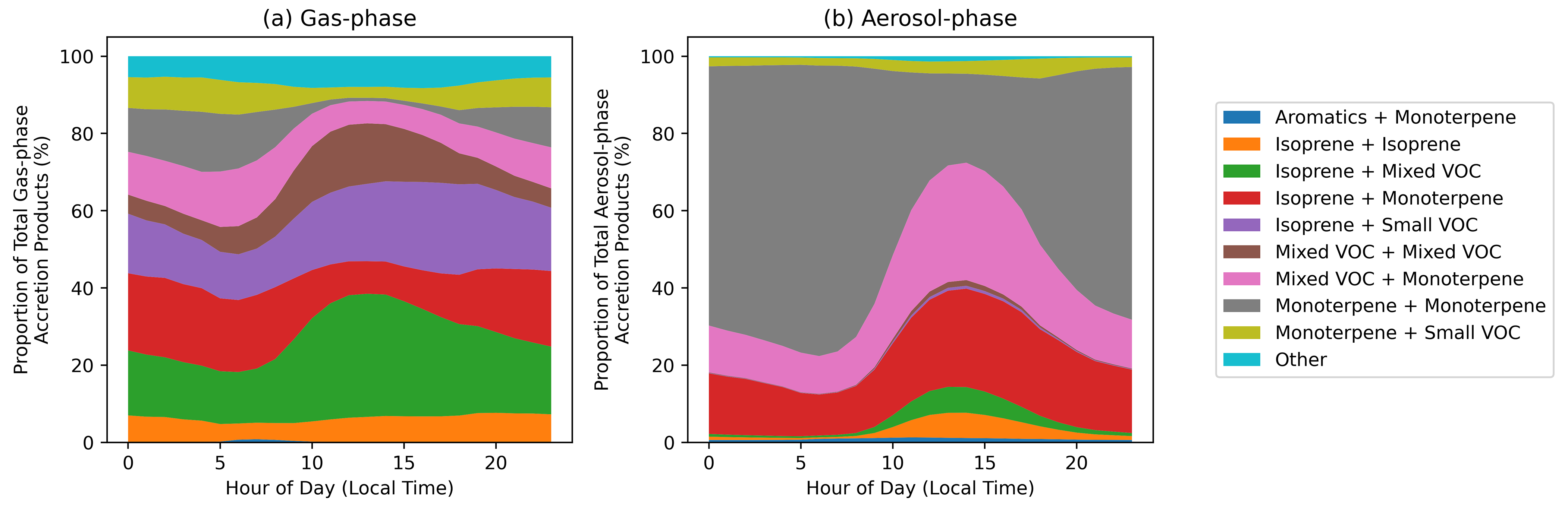 Figure 11Proportional contribution of different VOC precursor combinations to gas-phase (a) and particle-phase (b) RO2 accretion product concentrations in the MCM-Accr SOAS box models. RO2 are assigned to categories based on their original precursor VOC. Available categories are “Isoprene”, “Monoterpenes”, “Aromatics”, and “Other VOC”. “Mixed VOC” refers to RO2 that can form from more than one of these groups. Due to their diverse sources, any RO2 with fewer than four carbon atoms are split into a separate category called “Small VOC”.