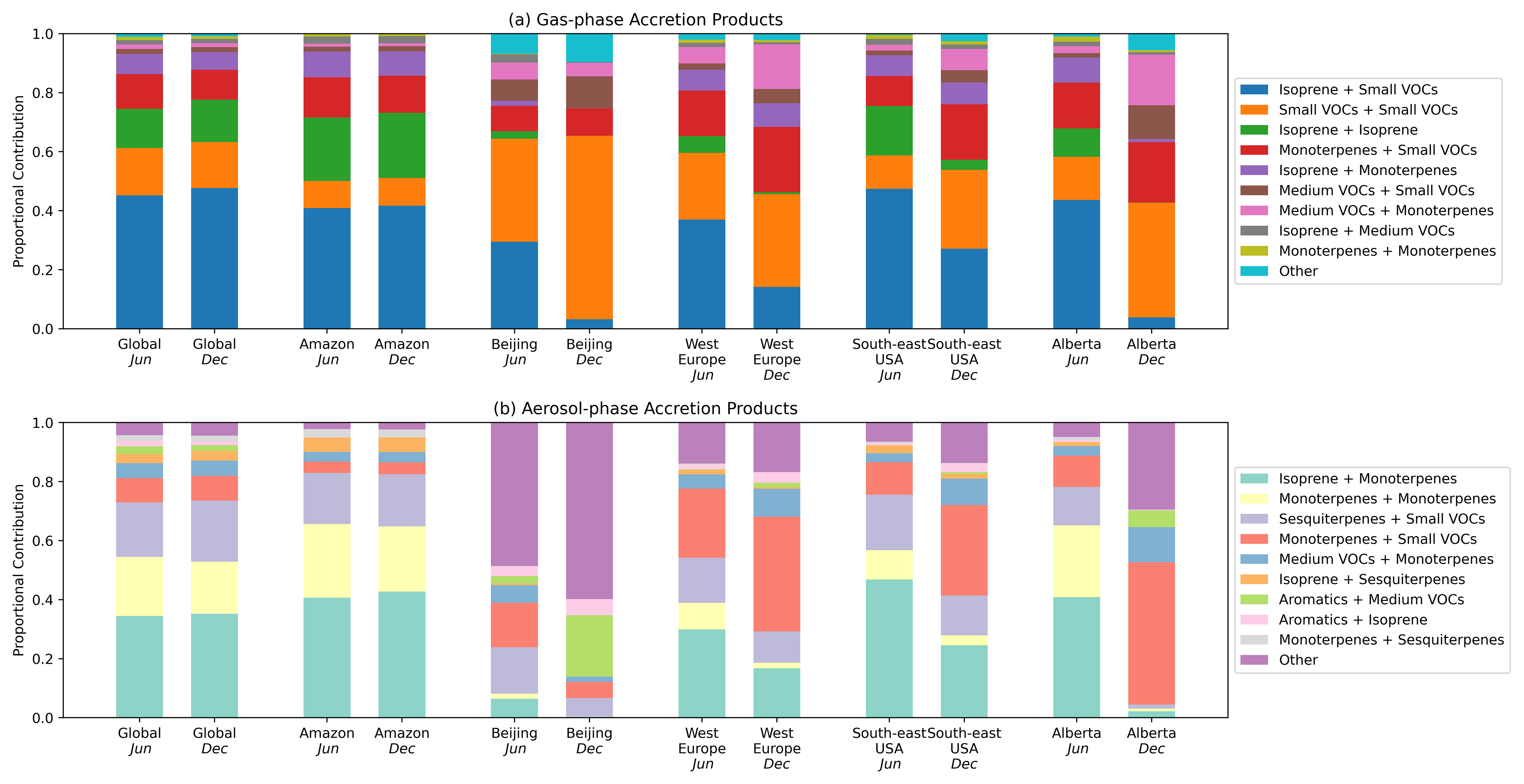 Analysis of the contributions of global average VOC precursors to aerosol-phase accretion products highlights the dominance of biogenic VOCs to accretion product formation, providing support to previous work that has focused only on BVOC RO2 species. However, our results demonstrate that aromatic species can also be an important precursor in polluted urban environments and those impacted by biomass burning, despite their relatively low contribution to gas-phase accretion product concentrations. Furthermore, this work has highlighted the role of small RO2 (particularly the peroxyacetyl radical) to accretion product formation, including contribution to SOA when combining with an RO2 from a larger precursor VOC class like monoterpenes and sesquiterpenes.