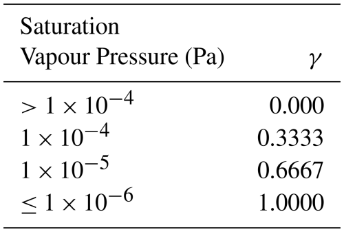In order to match the implementation of the formation of aerosol phase compounds in GEOS-Chem, box model simulations using the Reduced-GC-Accr mechanism used a first- order uptake term in place of the reversible partitioning used in the GC-Accr and MCM-Accr mechanisms. The first-order rate constants (k1stOrd) are calculated according to Eqs. (6)–(7), taken from the first-order uptake of other low volatility compounds already included in GEOS-Chem. In the Reduced-GC-Accr box models, Dg is calculated according to Eq. (7), as opposed to assuming a constant value of 0.1 cm2 s−1, as was done for the reversible partitioning models, in order to match the representation in GEOS-Chem (Eq. 7). The air density in molecules cm−3 is denoted by M. Results from the reversible partitioning models were analysed to determine the saturation vapour pressures at which accretion products were present almost entirely in the gas and particle phases. From this, it was determined that the particle-phase uptake was negligible for species with a saturation vapour pressure above Pa, and that species with a saturation vapour pressure of Pa or lower existed almost entirely in the particle-phase. As such, uptake coefficients (γ) for each species were assigned according to Table 1.