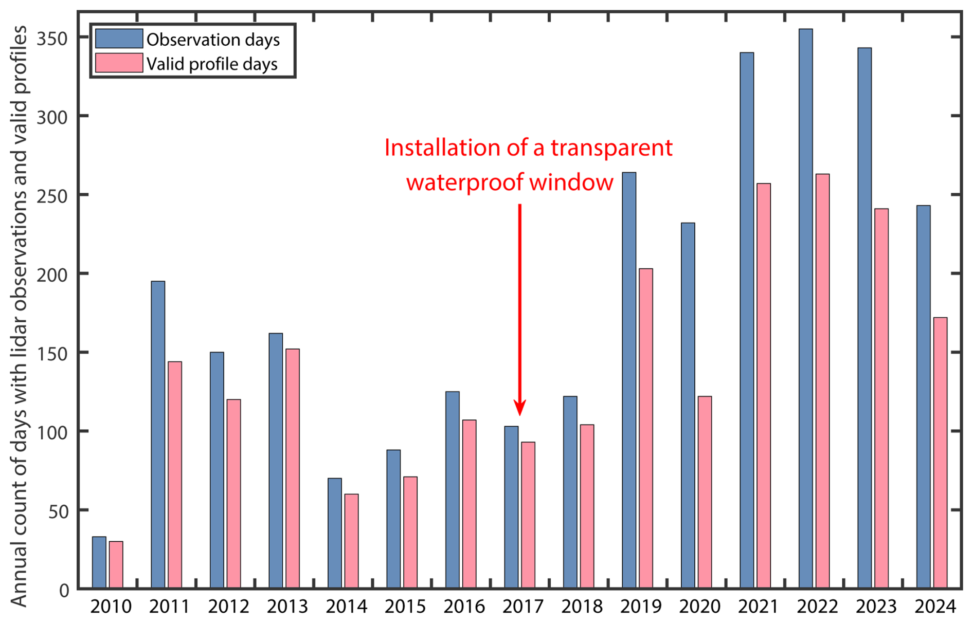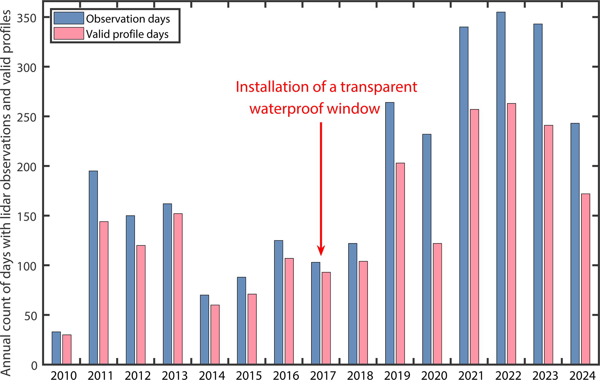 After cloud screening, cloud-free profiles with a duration time of 30–80 min and a vertical resolution of 30 m are obtained (Yin et al., 2021b). From October 2010 to September 2024, in total of 24 910 cloud-free profiles were derived from 2139 d for further statistical study (Fig. 1). Since the installation of a transparent waterproof window in 2017, the lidar system can continuously perform regardless of rainy or snowy conditions, except for occasional maintenance (Yi et al., 2021). Therefore, the number of observation days can even exceed 300 d in recent years (2021–2023).