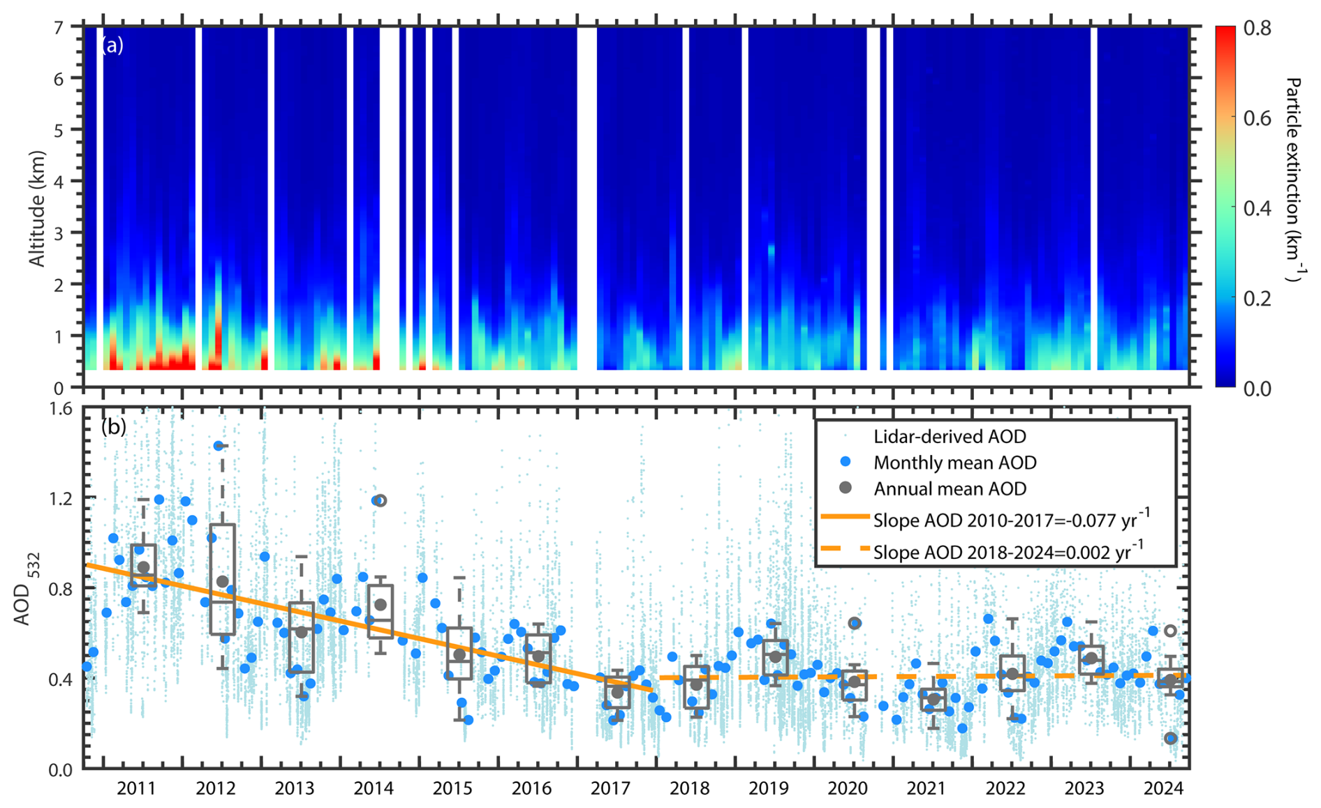 Figure 2(a) Time-altitude contour plots of the monthly mean particle extinction coefficient derived from 532 nm polarization lidar observations over Wuhan from 2010 to 2024. White stripes indicate periods with data unavailable due to weather conditions, hardware maintenance, or fewer than 15 cloud-free profiles being recorded in a given month. (b) AOD values for the monthly mean (blue dots) and individual cloud-free profile (light blue dots) over Wuhan during 2010–2024. The orange solid and dashed lines represent the linear fits of the monthly mean AOD for the periods 2010–2017 and 2018–2024, respectively. A box plot is presented for each year during 2011–2024, with the center line indicating the median value and the bottom and top edges representing the 25th and 75th percentiles, respectively. The whiskers are set to be 1.5, and hollow circles denote outliers. Gray solid dots represent the annual mean values.