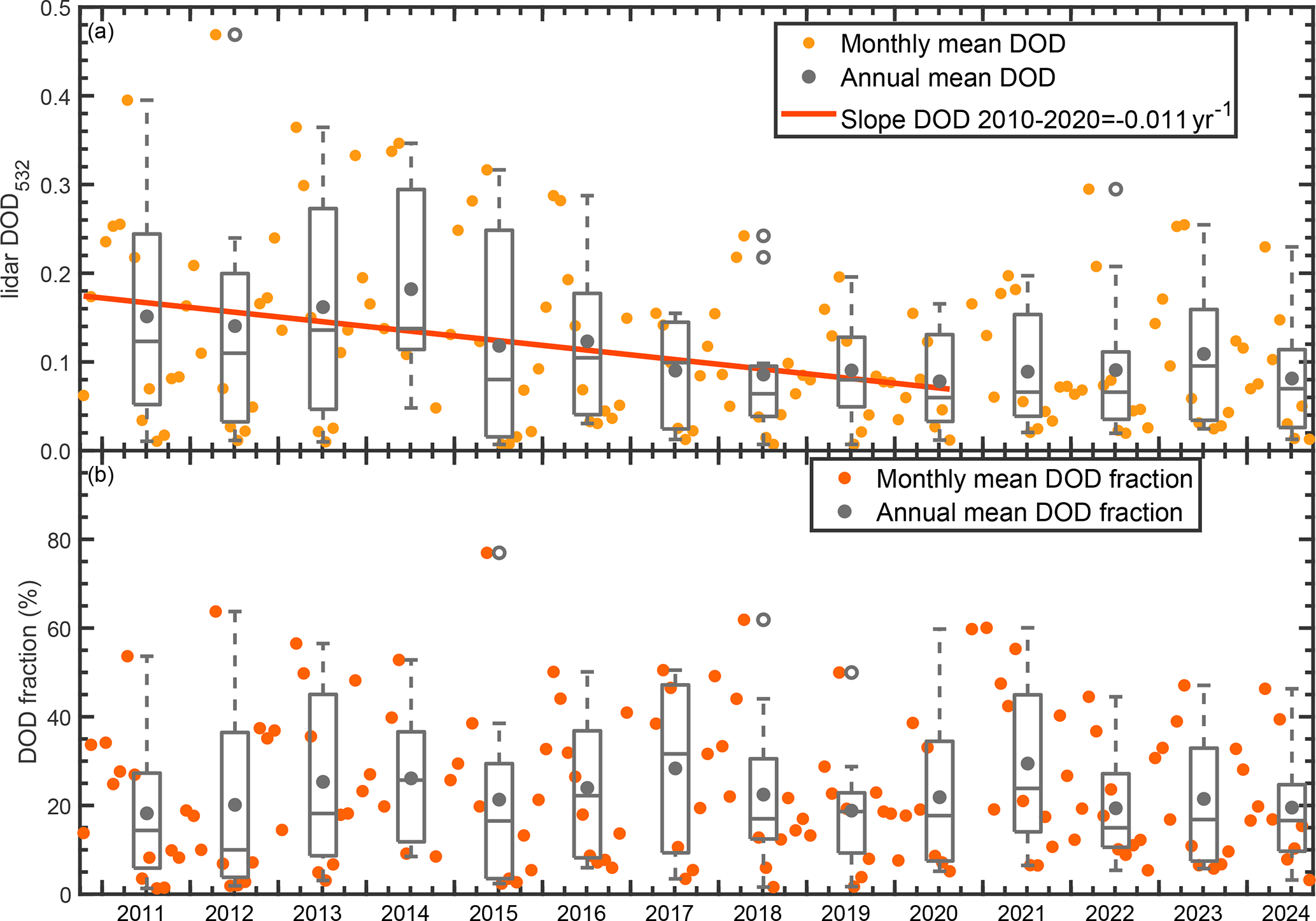 Figure 3Monthly mean (a) DOD and (b) the ratio of DOD to total AOD from 2010 to 2024. A box plot is presented for each year during 2011–2024, with the gray solid dots representing the annual mean values. The dark orange line represents the linear fit of the monthly mean DOD from 2010 to 2020. The parameters for box plots are the same as in Fig. 2.