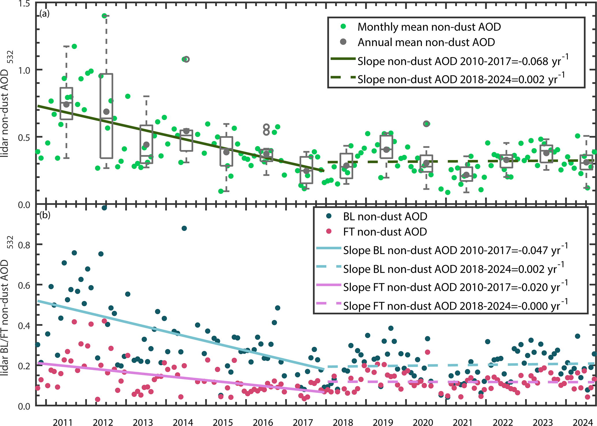Figure 4(a) Monthly mean non-dust AOD in Wuhan (green dots) from 2010 to 2024. A box plot is presented for each year during 2011–2024. The parameters for box plots are the same as in Fig. 2. Gray solid dots represent the annual mean values. (b) Monthly mean BL (dark green dots) and FT (pink dots) non-dust AOD in Wuhan from 2010 to 2024. Linear fitted lines for the periods 2010–2017 and 2018–2024 are represented by solid and dashed lines, respectively.