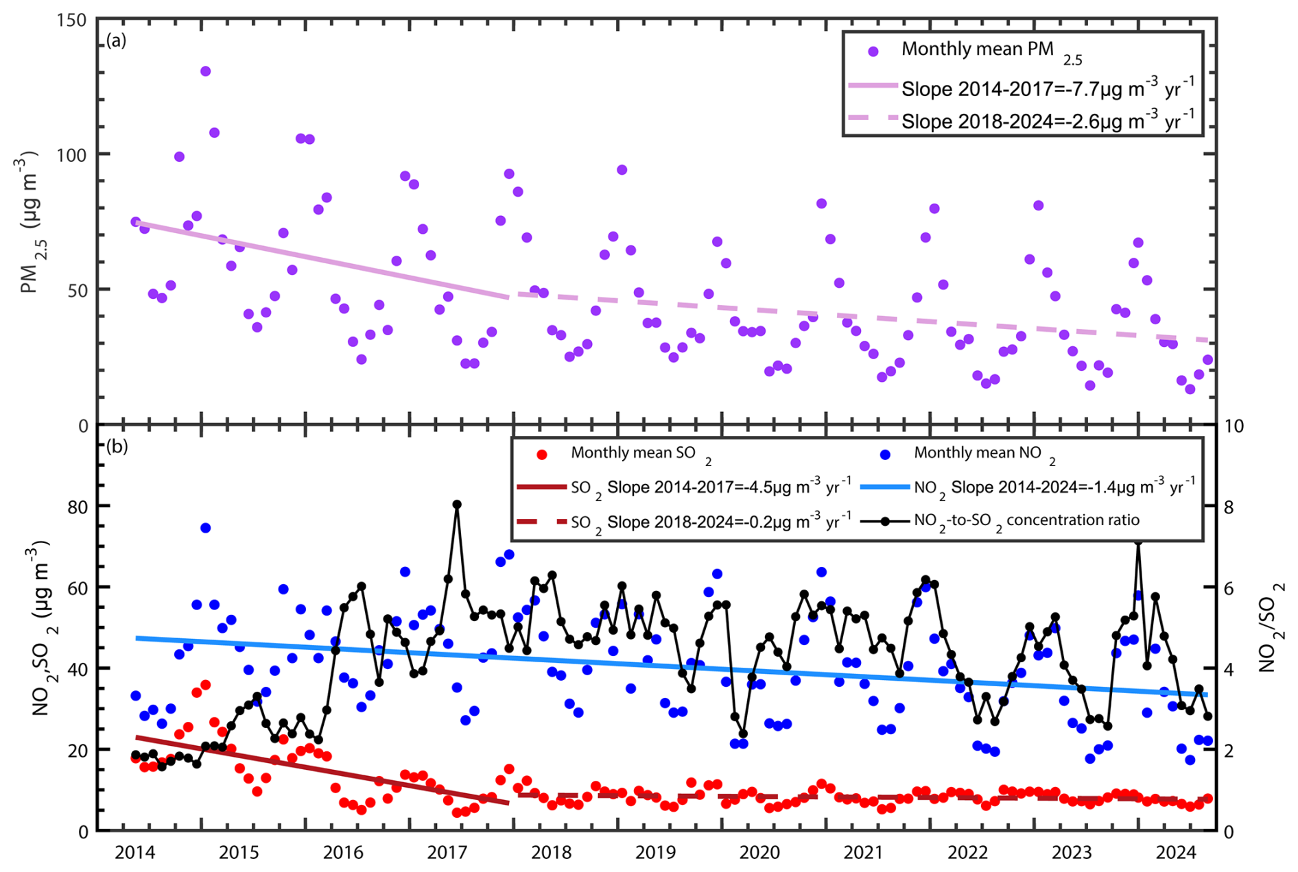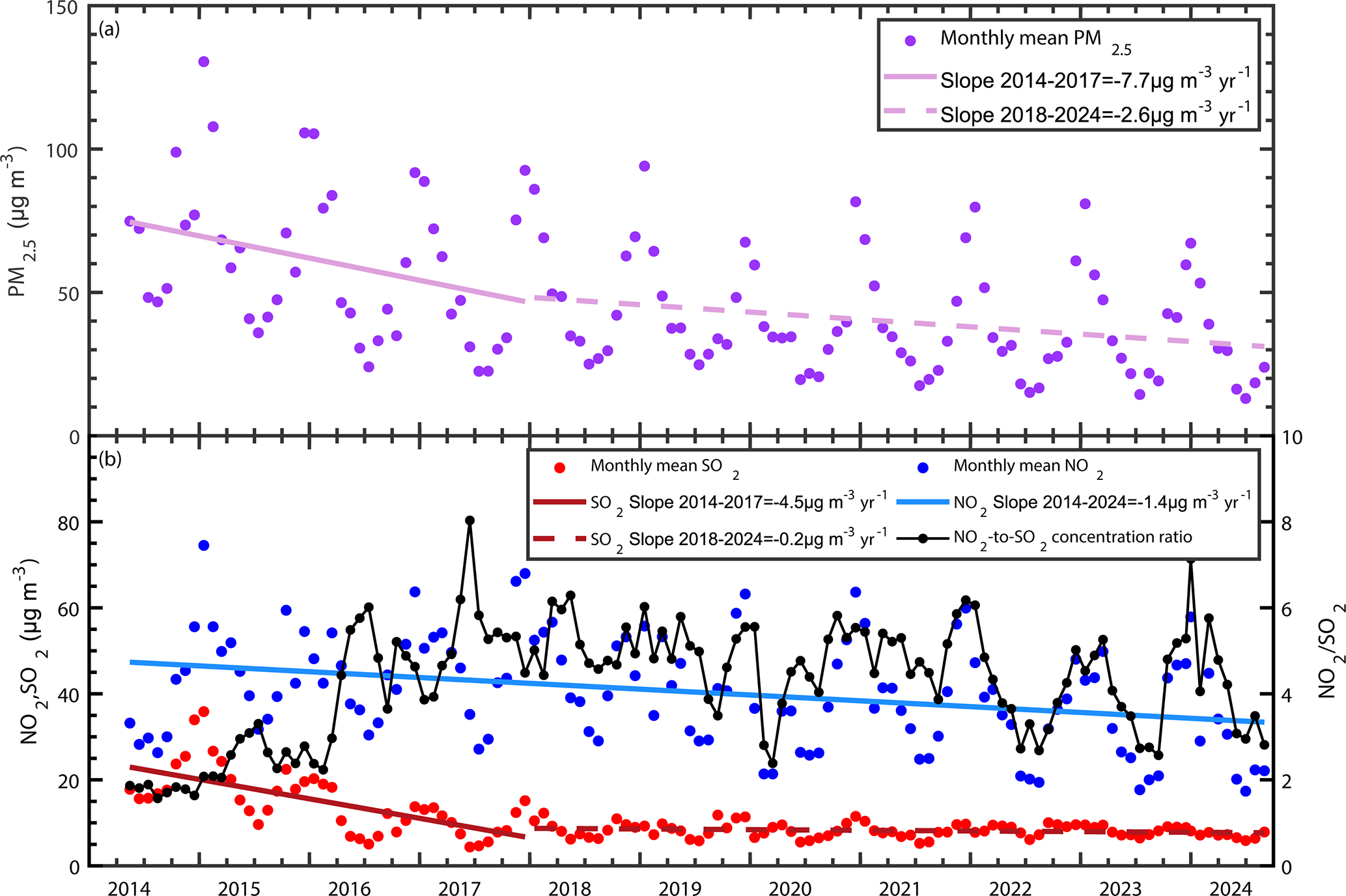 Figure 5Monthly mean (a) PM2.5 concentration, and (b) SO2 and NO2 concentrations from May 2014 to September 2024. Solid and dashed lines represent the linear fits for the periods 2014–2017 and 2018–2024, respectively. The NO2-to-SO2 concentration ratio is shown in black.