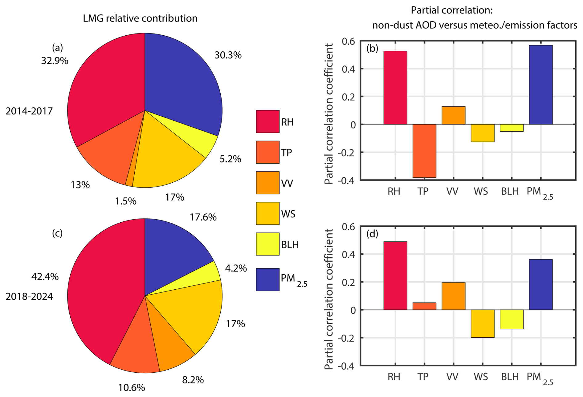 Figure 6The LMG method-estimated relative contributions (%) of monthly mean meteorological variations and PM2.5 concentration on monthly mean non-dust AOD during (a) 2014–2017 and (c) 2018–2024. The partial correlation analyses between non-dust AOD and variations during 2014–2017 and 2018–2024 in (a) or (c) were presented by (b) and (d), respectively. Meteorological parameters are represented by acronyms as: relative humidity (RH), total precipitation (TP), vertical velocity (VV), wind speed (WS), boundary layer height (BLH).