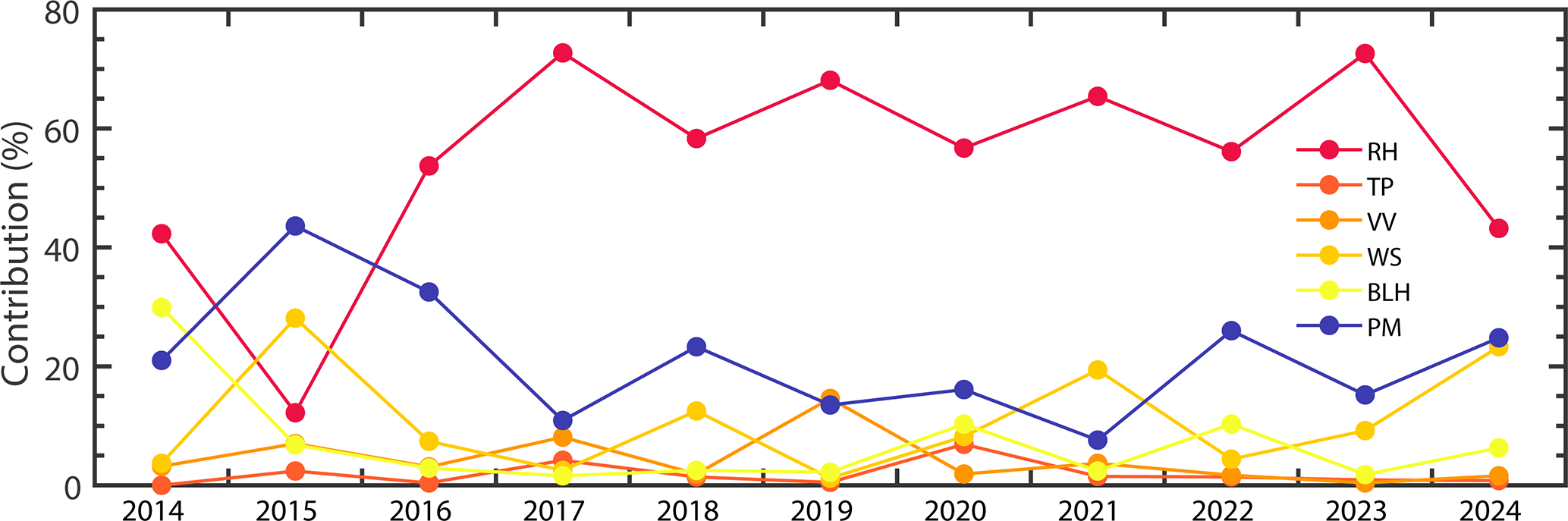 In addition, the annual variation in the LMG method-derived relative contributions of daily mean meteorological and anthropogenic factors are presented in Fig. 7. The trends of the dominant factors, RH and PM2.5, show increasing and decreasing patterns from Stage I to Stage II, respectively. Overall, the contribution of RH is larger than that of PM2.5 except in 2015. In Stage II, the notable increase in non-dust AOD in 2018 is associated with the increased contribution of PM2.5, which rises to 21 % compared with 8 % in 2017. In 2019, the contribution of vertical velocity is comparable to that of PM2.5, which is inferred to be related to regional pollution transportation. From 2020 to 2021, the contribution of PM2.5 decreases due to the COVID-19 lockdown. In 2021, wind speed contributes more than PM2.5, likely due to enhanced air cleansing by cold air transported from high latitudes under the “Warm Arctic-Cold Siberia” pattern (Zhang et al., 2021b). After 2022, the contribution of PM2.5 increases to around 20 %, coinciding with the resumption of industrial activities and production. It is worth noting that the contribution of RH is around 60 % in Stage II, even exceeds 70 % in 2023, which is higher than the value shown in Fig. 6c. This difference arises because the contributions in Fig. 7 are based on daily mean values rather than monthly means. Under these circumstances, the daily variability of RH is more pronounced than that of other meteorological variables, and the influence of hygroscopic growth on aerosol backscatter and thus AOD is more direct.