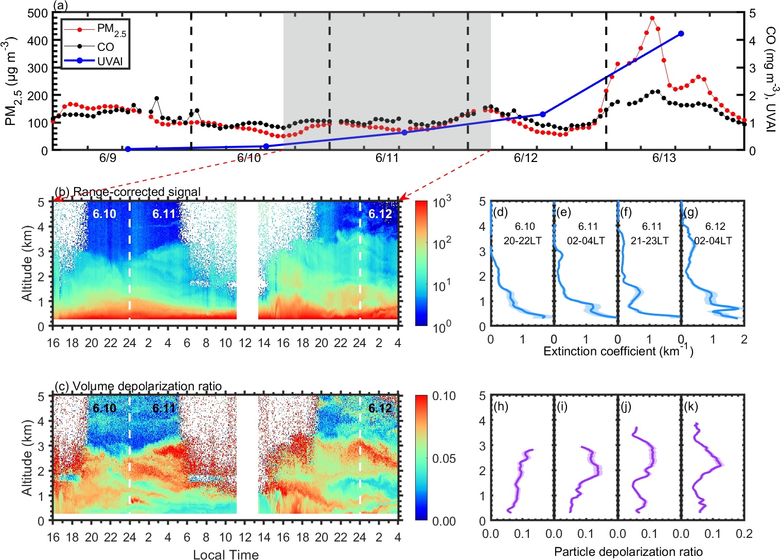 Figure 9(a) PM2.5, CO concentrations at the surface, and UVAI measured by OMPS in Wuhan on 9–13 June 2014. Time-altitude contour plots of (b) range-corrected signal and (c) volume depolarization ratio measured by polarization lidar over Wuhan from 10 to 12 June (local time, UTC+8). The gray shaded area indicates the period of lidar observations. Selected typical profiles of extinction coefficient (d–g) and particle depolarization ratio (h–k).