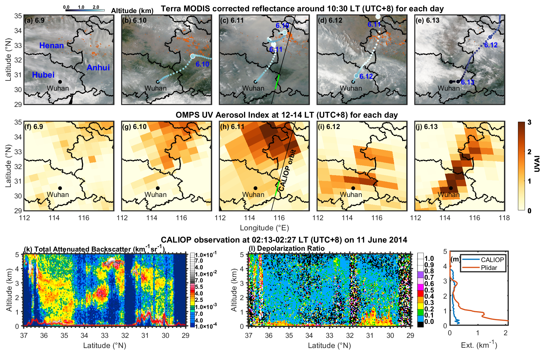 The Ozone Mapping and Profiler Suite (OMPS), carried on the Suomi National Polar-orbiting Partnership (Suomi NPP) satellite launched in October 2011 (Jaross et al., 2014), comprises a downward-looking nadir mapper, a nadir profiler, and a limb profiler. Among them, the nadir mapper provides the measurement of UV Aerosol Index (UVAI) with a spatial resolution of 50×50 km, which is an effective indicator of elevated UV-absorbing aerosols (e.g., smoke and dust) (Lee et al., 2015; Tao et al., 2022). In this study, the UVAI provided by OMPS-NPP level 2 data was used to exhibit the spatial evolution of the biomass-burning smoke event in June 2014 near Wuhan.
