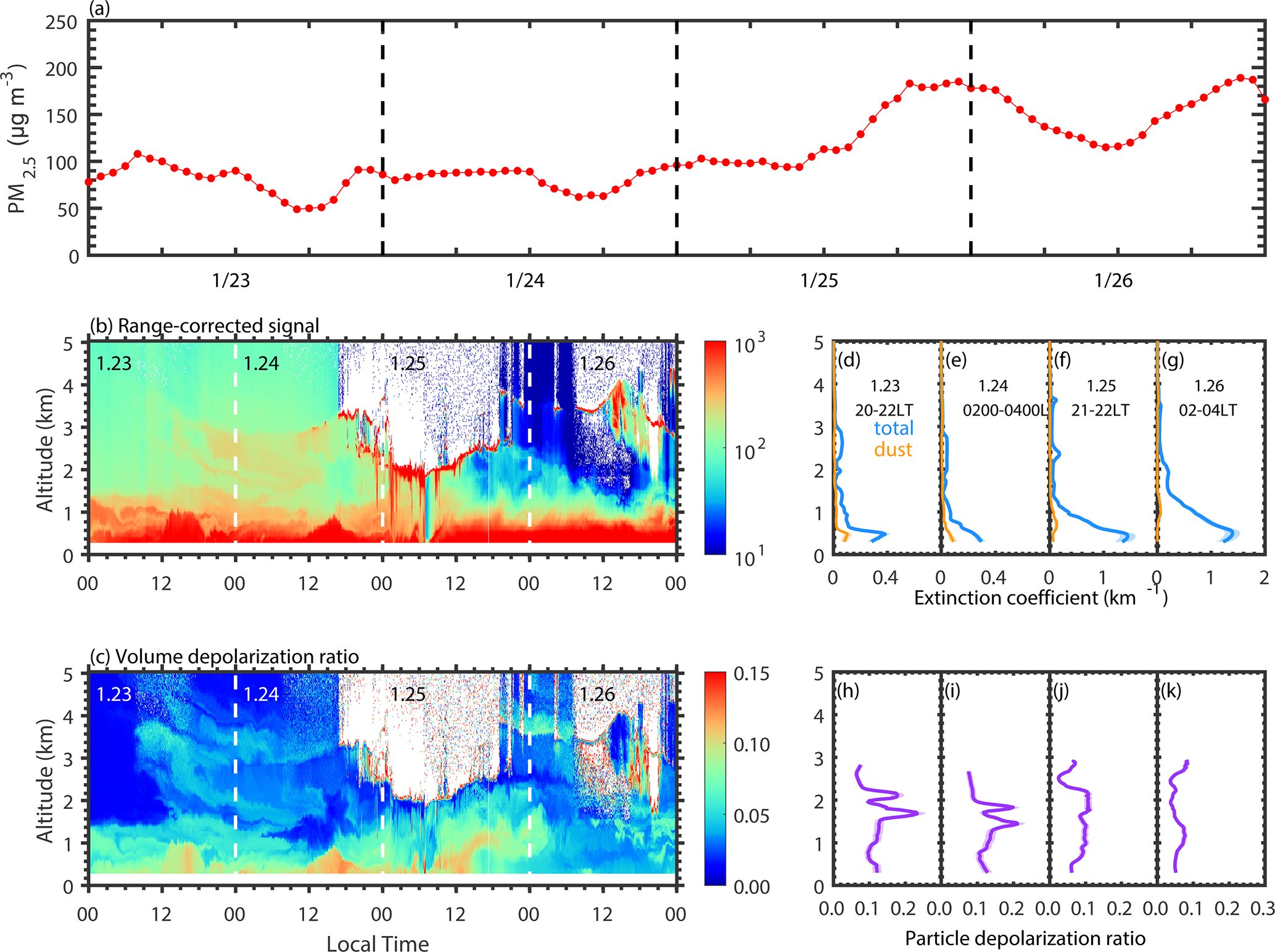 Figure 11(a) PM2.5 concentration in Wuhan on 23–26 January 2019, and time-altitude contour plots of (b) range-corrected signal and (c) volume depolarization ratio measured by polarization lidar over Wuhan during the same period. Selected typical profiles of extinction coefficient (d–g) and particle depolarization ratio (h–k).