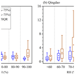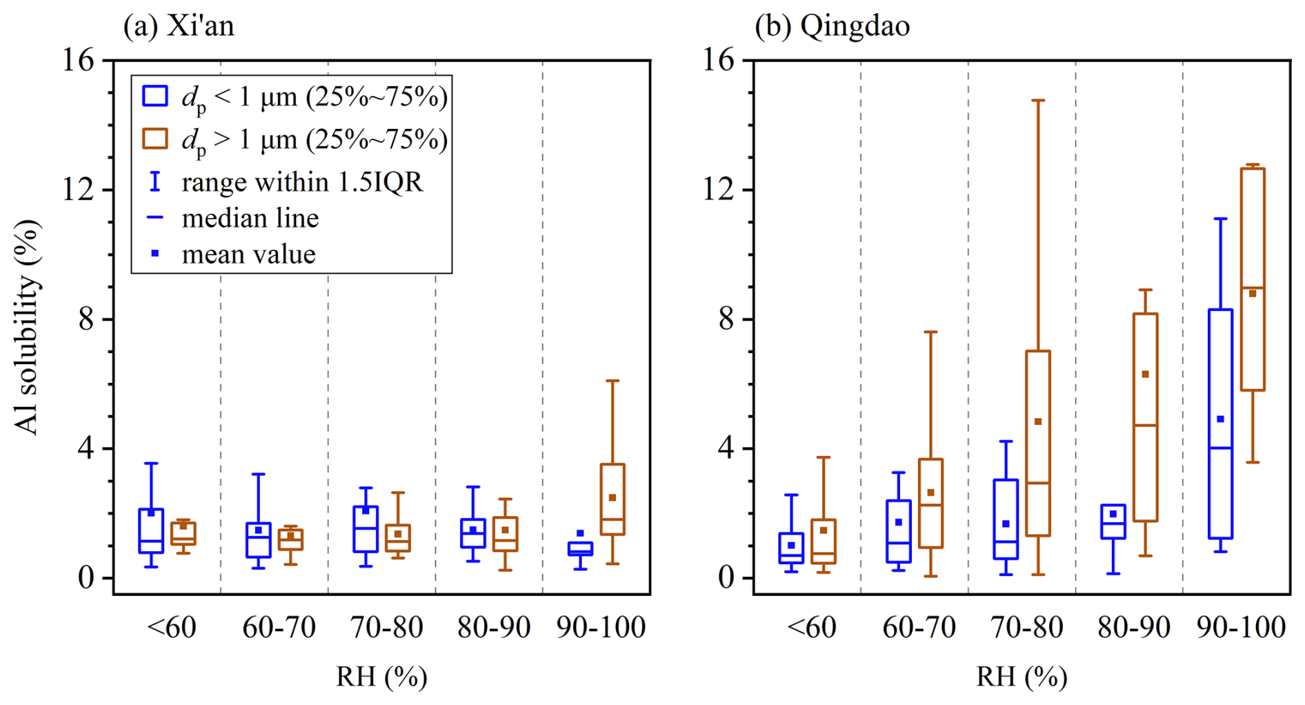 Figure 7Aerosol Al solubility at different relative humidity (RH) for submicron and supermicron particles: (a) Xi'an, (b) Qingdao.