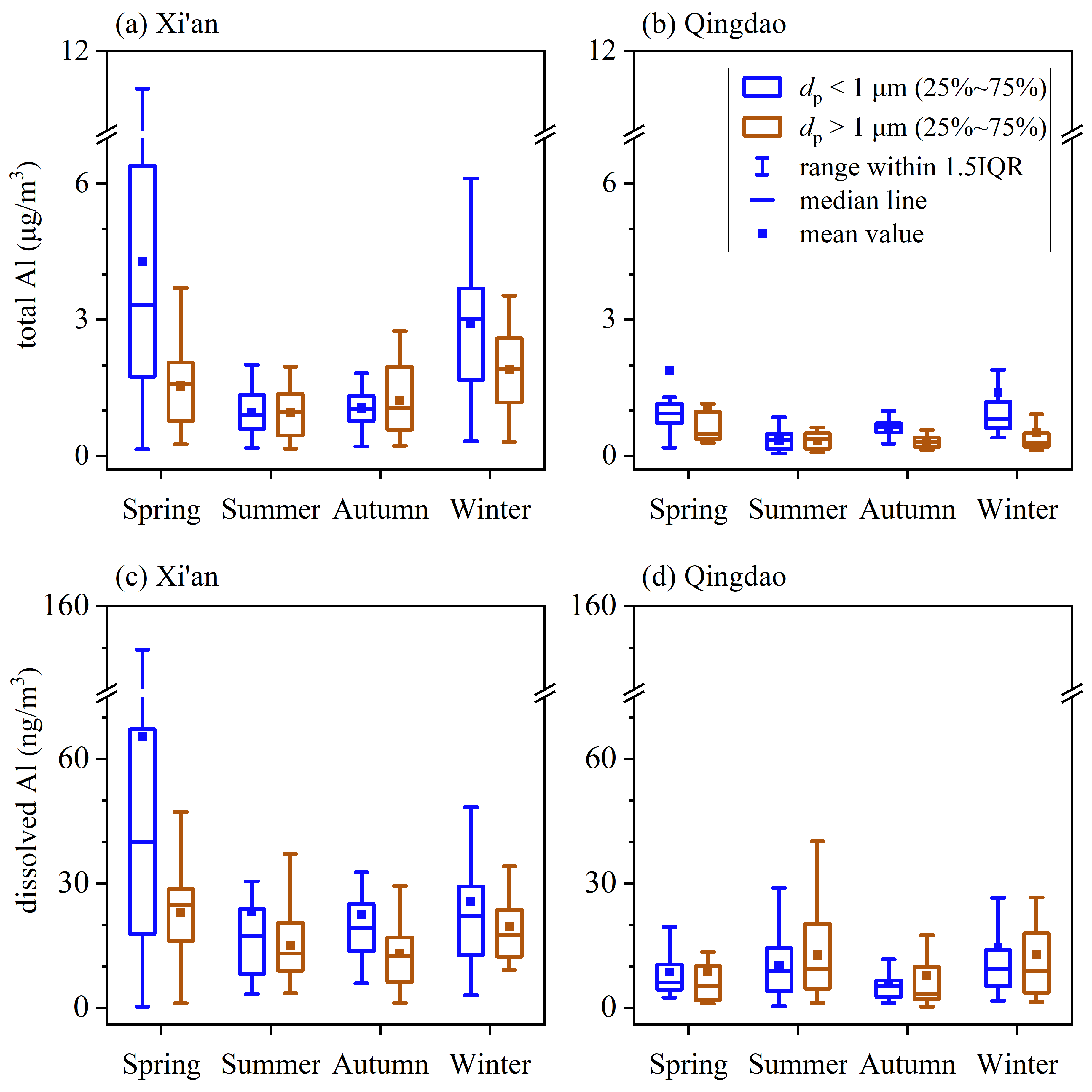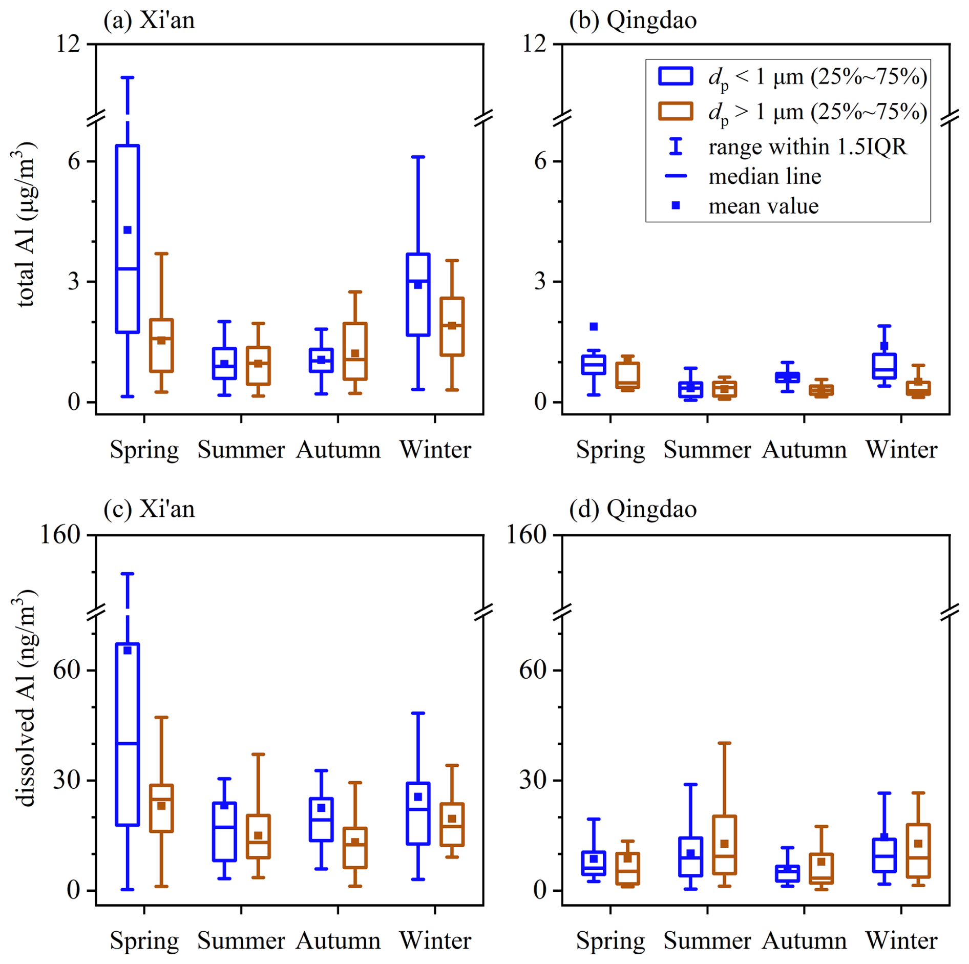 Figure 2 displays seasonal variations of total and dissolved aerosol Al at Xi'an and Qingdao. At Xi'an (Fig. 2a), total Al in supermicron particles showed highest concentrations in spring and winter (1.54 ± 0.89 and 1.91 ± 0.93 µg m−3) and lowest concentrations in summer (0.96 ± 0.54 µg m−3); a similar seasonal pattern was observed for submicron particles, with total Al concentrations being highest in spring and winter (4.29 ± 3.70 and 2.92 ± 1.47 µg m−3) and lowest in summer (0.95 ± 0.44 µg m−3). At Qingdao (Fig. 2b), total Al concentrations in supermicron particles were highest in spring (1.04 ± 1.12 µg m−3) and lowest in summer and autumn (0.33 ± 0.18 and 0.31 ± 0.12 µg m−3); similarly, for submicron particles, total Al concentrations were also highest in spring (1.88 ± 2.51 µg m−3) and lowest in summer and autumn (0.35 ± 0.22 and 0.65 ± 0.82 µg m−3). For each season the median concentration of total aerosol Al was usually higher in submicron particles than supermicron particles at both locations (and there were some exceptions, as shown in Fig. 1a and b). This is related to size dependence of mineralogy and elemental compositions of mineral dust aerosol, which is not well studied and deserves further investigation.