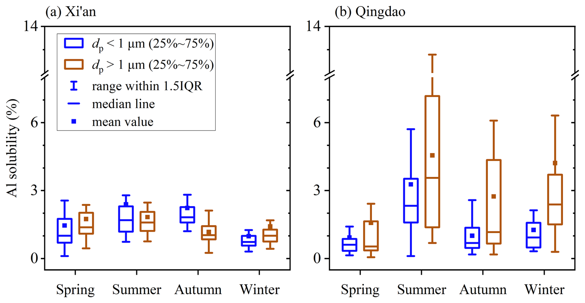 On the other hand, no obvious difference in aerosol Al solubility was observed between Xi'an and Qingdao in spring, with median aerosol Al solubilities being <1.4 % for supermicron and submicron particles (Fig. 3). This agrees with a previous study (Hsu et al., 2010) which found that aerosol Al solubility was very low (average:  0.7 %) in spring even over the East China Sea. Furthermore, similar to what we observed in spring at Xi'an and Qingdao, Al solubility was found to be low (<1.5 %) for surface soil particles (Mulder et al., 1989; Duvall et al., 2008; Shi et al., 2011; Aghnatios et al., 2014; Li et al., 2022). Overall, our work implies that in spring when Asian dust occurred most frequently, mineral dust particles arriving at Qingdao after long-distance transport did not show substantial increase in Al solubility.
