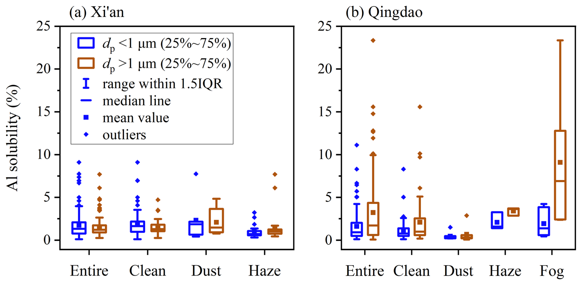 We encountered four representative weather conditions (i.e. clean, dust, haze and fog days) during our sampling at Xi'an and Qingdao, and investigated aerosol Al solubility under different weather conditions (Fig. 4, Tables S6–S7).